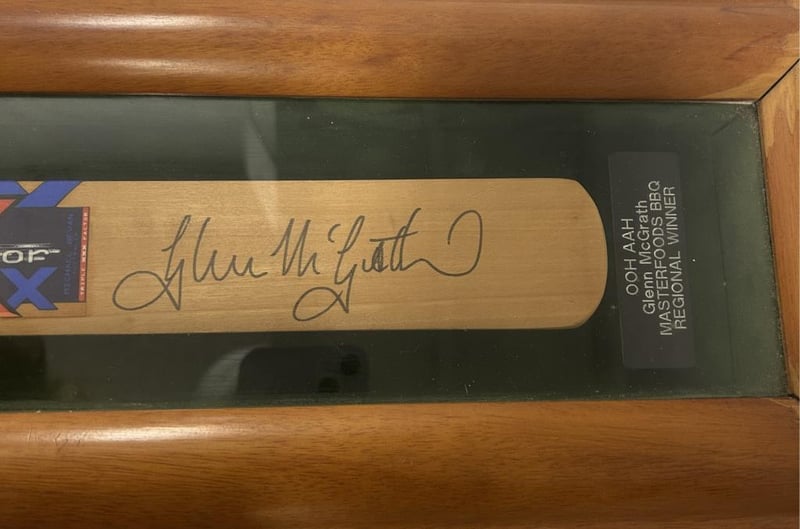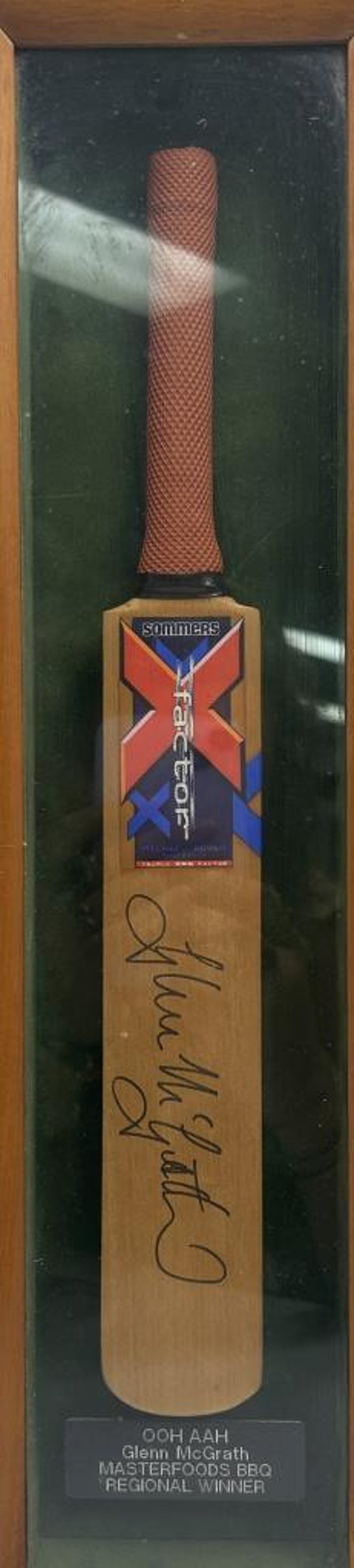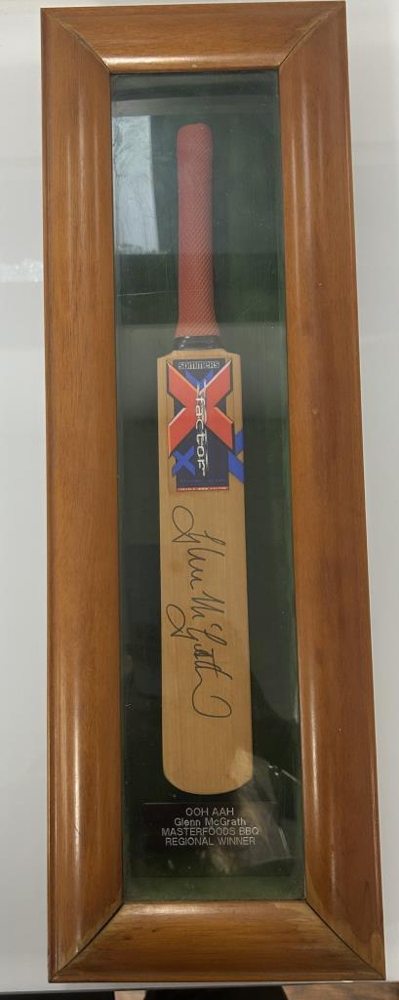 GLEN MCGRATH SIGNED MINATARE CRICKET BAT, 'OHH AAH MASTERFOODS BBQ REGIONAL WINNER, FRAMED IN WOODEN BOX, MEASURES 54 X17.5 X5.0CM.