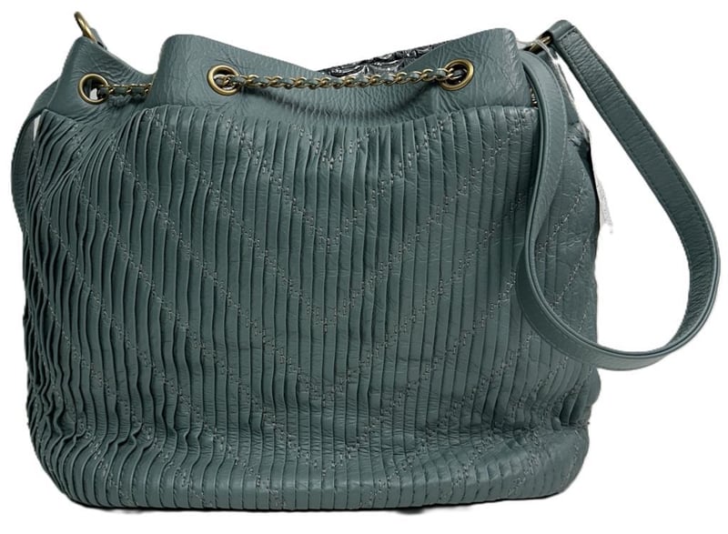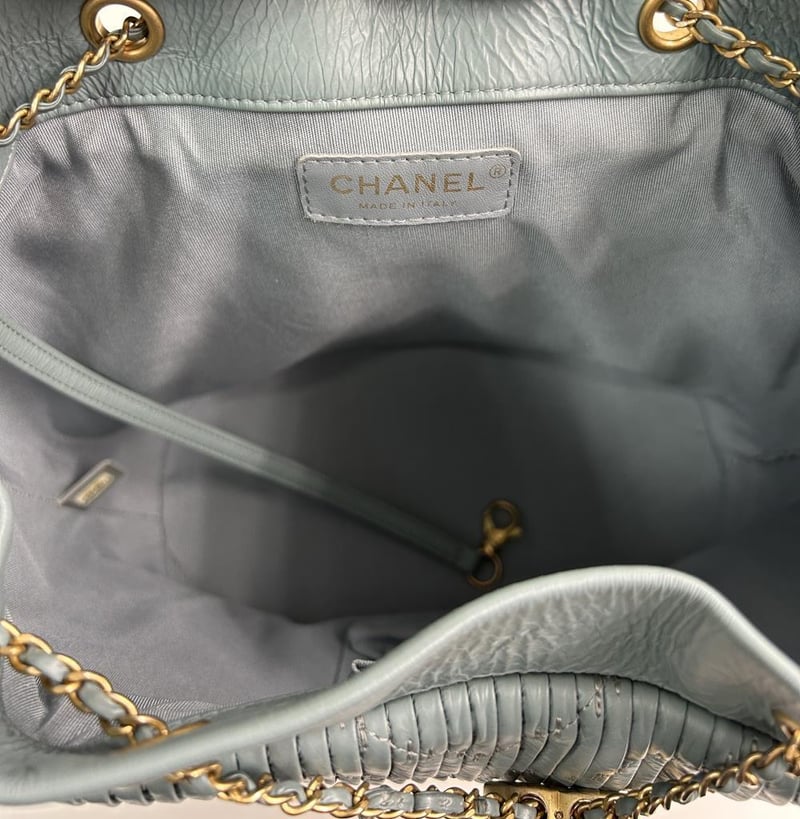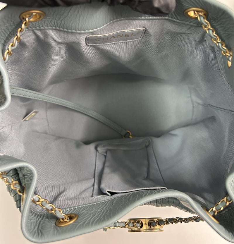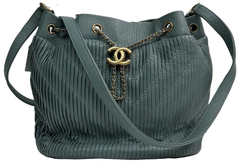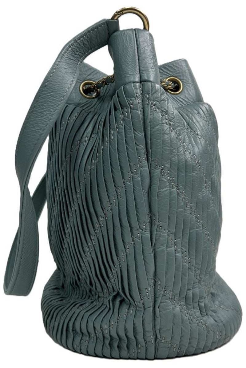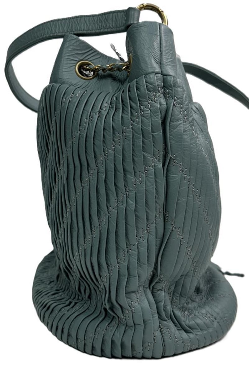 CHANEL COCO PLEATED BUCKET BAG, TOP DRAWSTRING CLOSURE WITH INTERLOCKING CC FASTENING, LIGHT TEAL LEATHER, SINGLE TOP STRAP, GOLD-TONE HARDWARE, POWDER BLUE RIB COTTON LINING WITH 1 SLIP POCKET, BAG MEASURES W26XH23XD17CM, MADE IN ITALY. THIS ITEM HAS BEEN PROFESSIONALLY VERIFIED AS A GENUINE PRODUCT AND COMES WITH ACCOMPANYING 3RD PARTY CERTIFICATE OF AUTHENTICITY