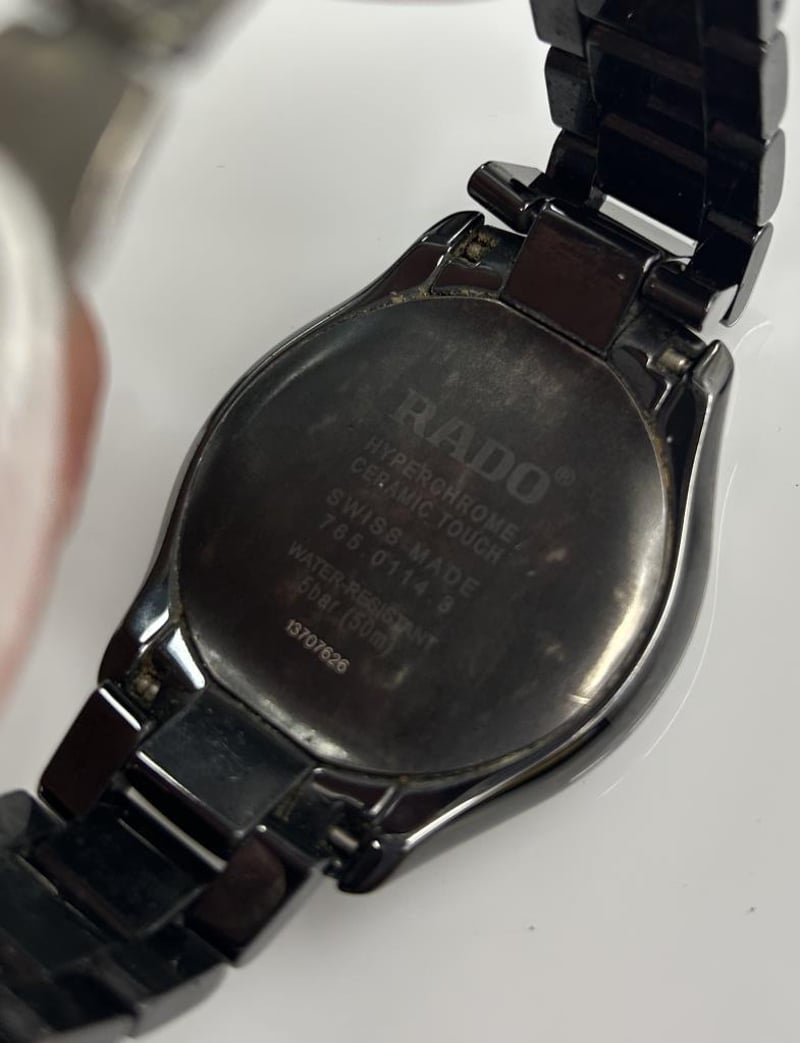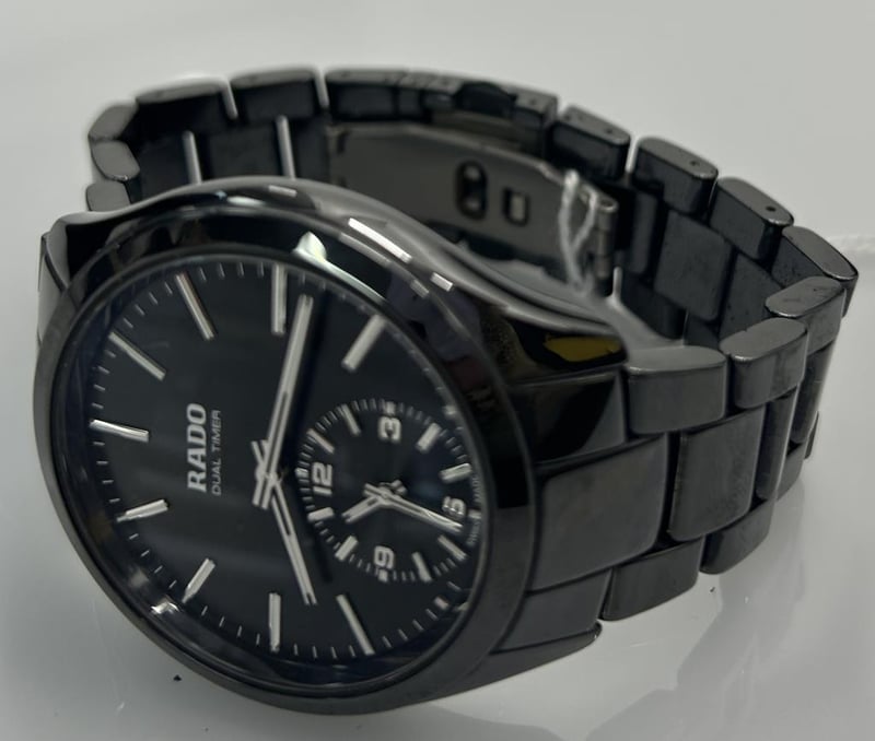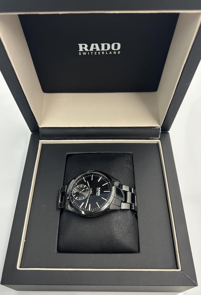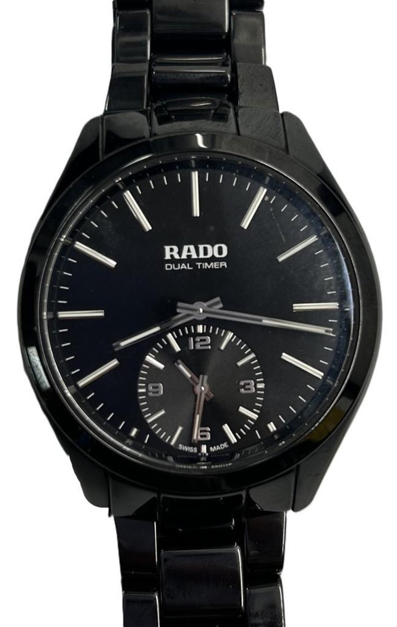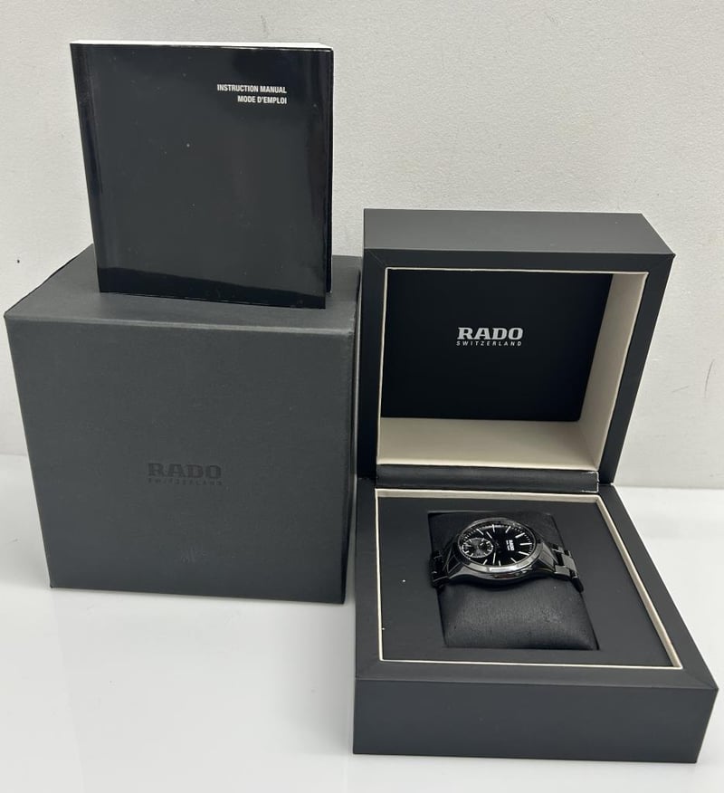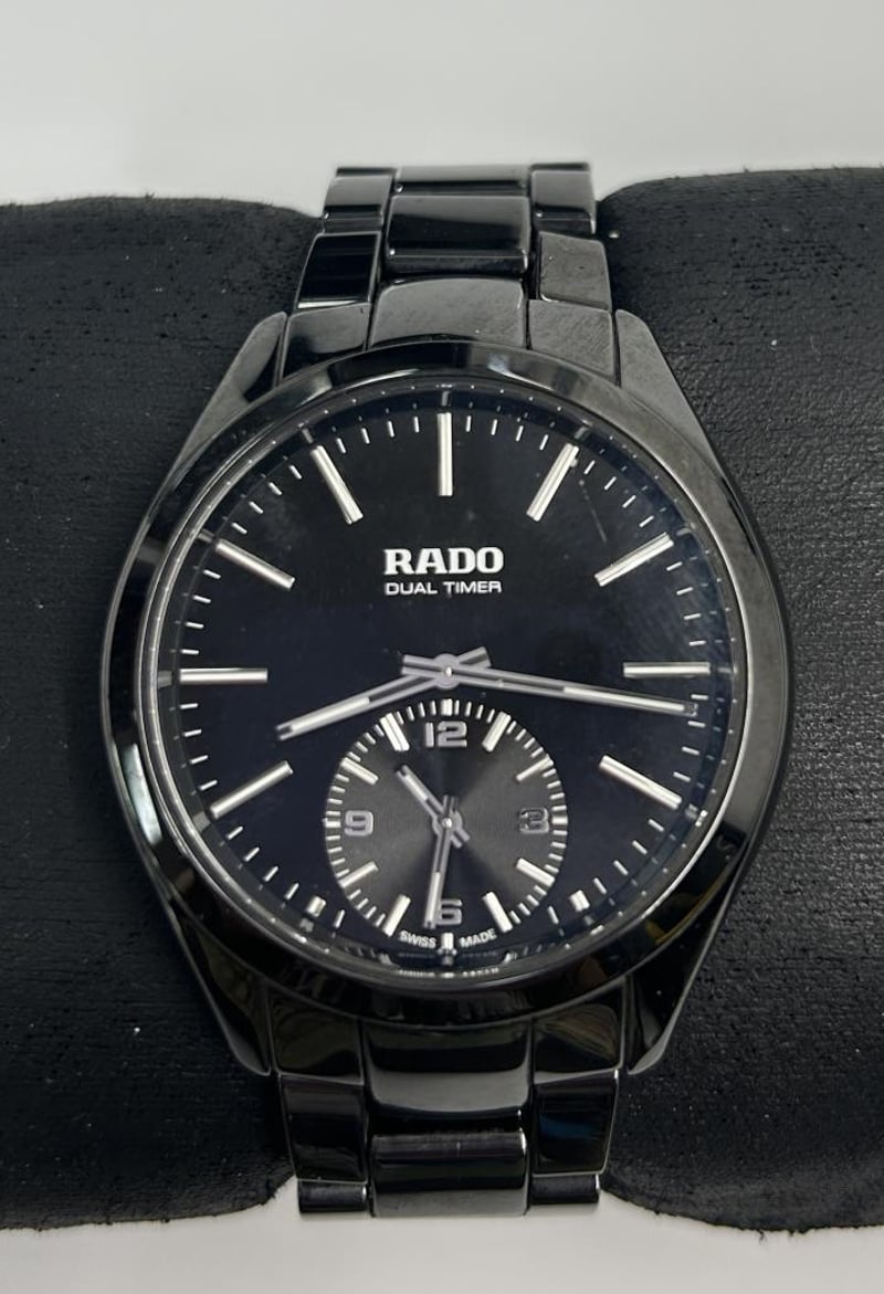 RADO HYPERCHROME DUAL TIMER WATCH, MODEL 765.0114.3, BLACK DIAL WITH DUAL TIME SUBDIAL AND SILVER-TONE INDICES, CASE MEASURES 42MM, WR 5 ATM, SWISS MADE, QUARTZ MOVEMENT, BLACK HIGH-TECH CERAMIC CASE AND BRACELET WITH FOLDING CLASP, INCLUDES ORIGINAL RADO PRESENTATION BOX.