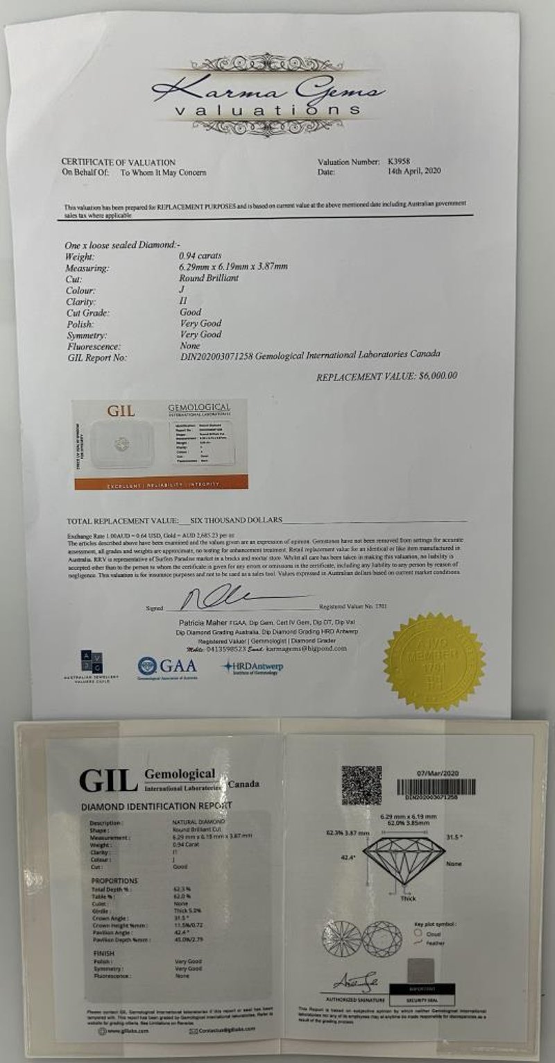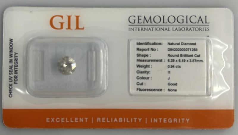 0.94CT NATURAL ROUND BRILLIANT DIAMOND, MEASURING APPROXIMATELY 6.29 × 6.19 × 3.87MM, THIS STONE EXHIBITS BRIGHT BRILLIANCE AND FIRE. IT HAS A J COLOUR GRADE WITH A CLARITY OF I1, AND IS FINISHED WITH A GOOD CUT, VERY GOOD POLISH, AND VERY GOOD SYMMETRY. FLUORESCENCE: NONE.