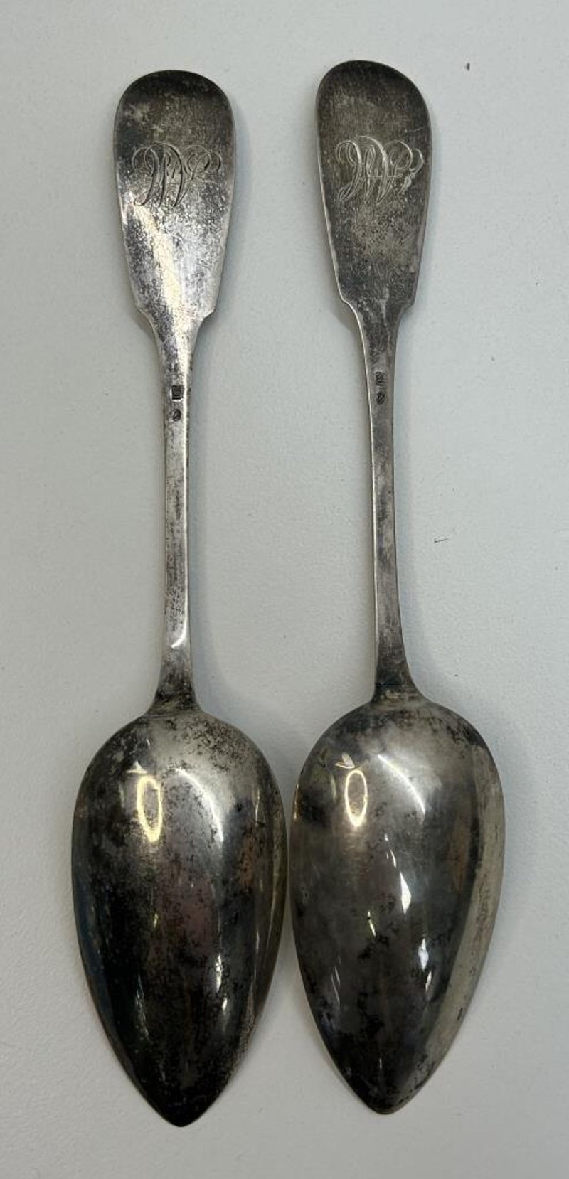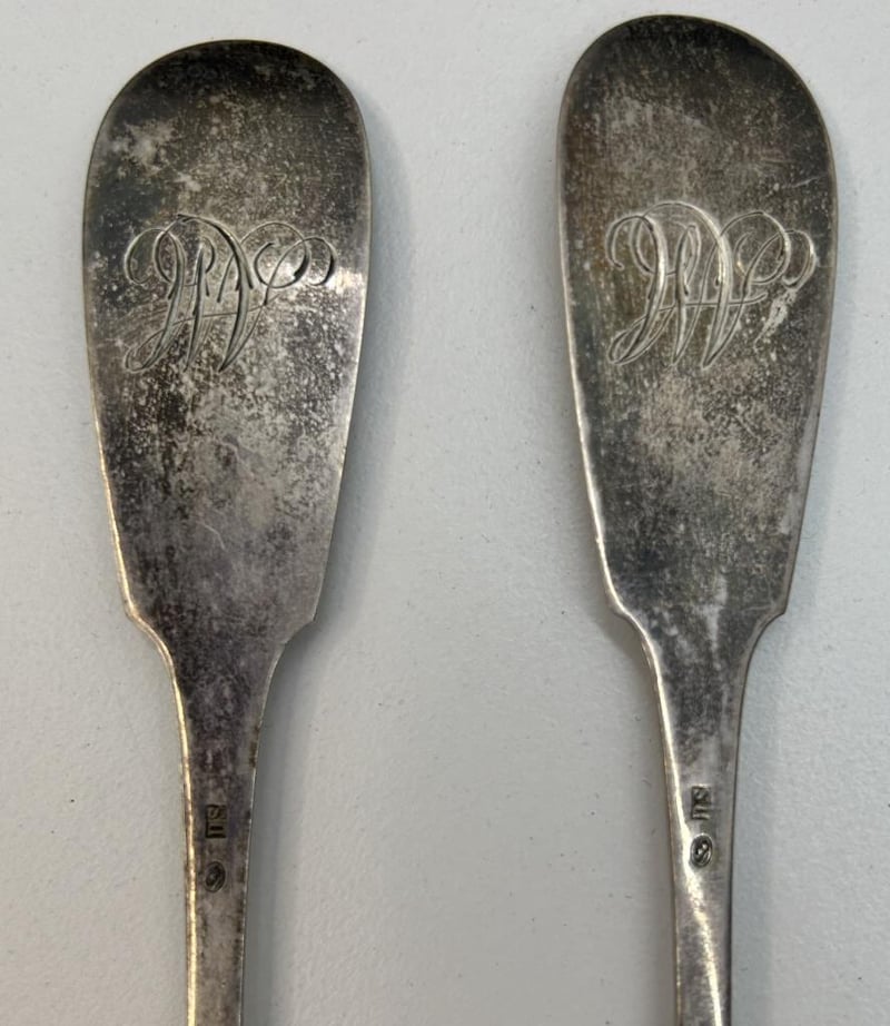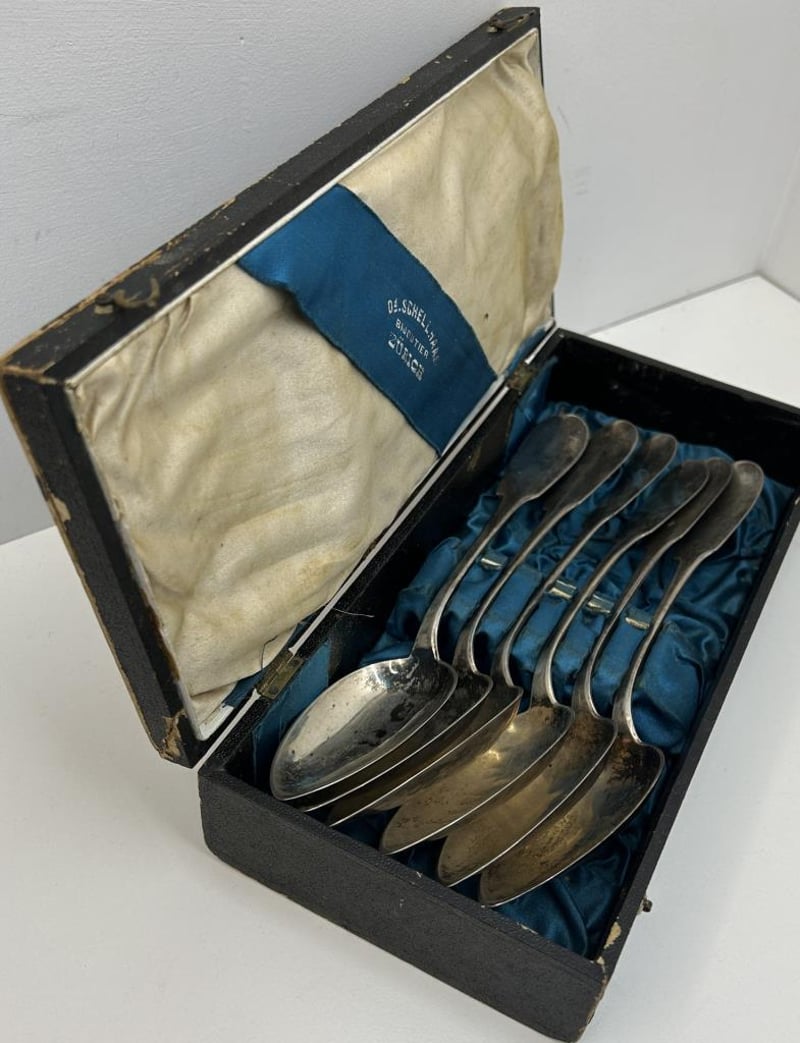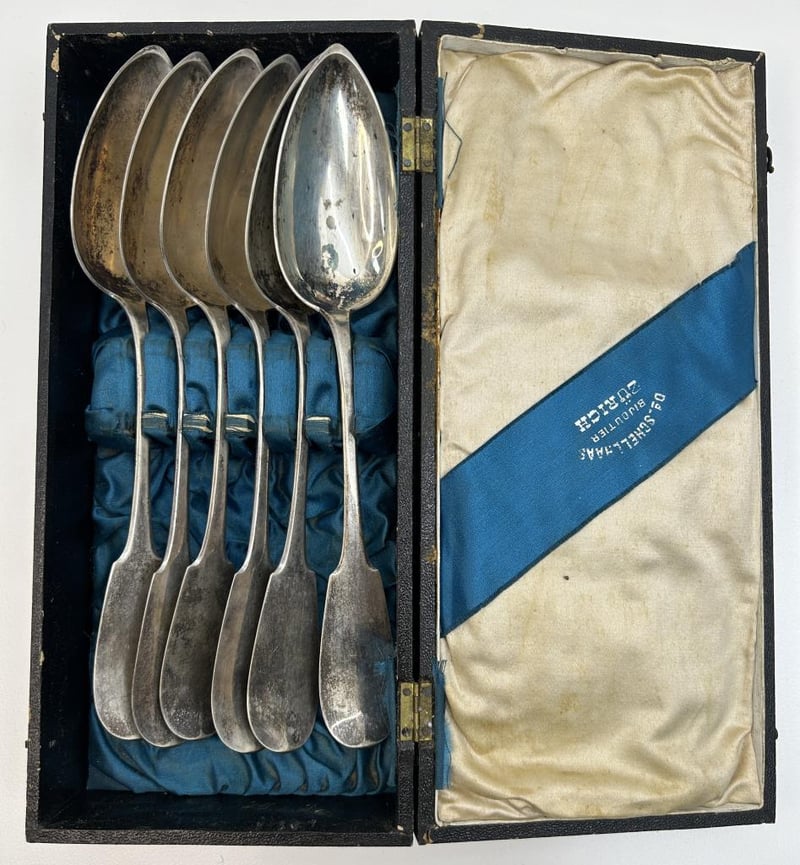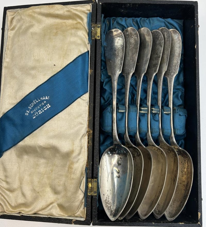 ANTIQUE ZURICH STERLING SILVER SPOON SET (6PC) - SHELLHAAS & BJOUTIER - XRF VERIFIED. THIS COLLECTORS' SET FEATURES SIX HEFTY ENGRAVED STERLING SILVER SPOONS, CRAFTED BY RENOWNED ZURICH SILVERSMITH DG. SHELLHAAS FOR LUXURY RETAILER BJOUTIER (C. 1890-1920). INCLUDES THE ORIGINAL WOODEN BOX WITH SATIN LINING.