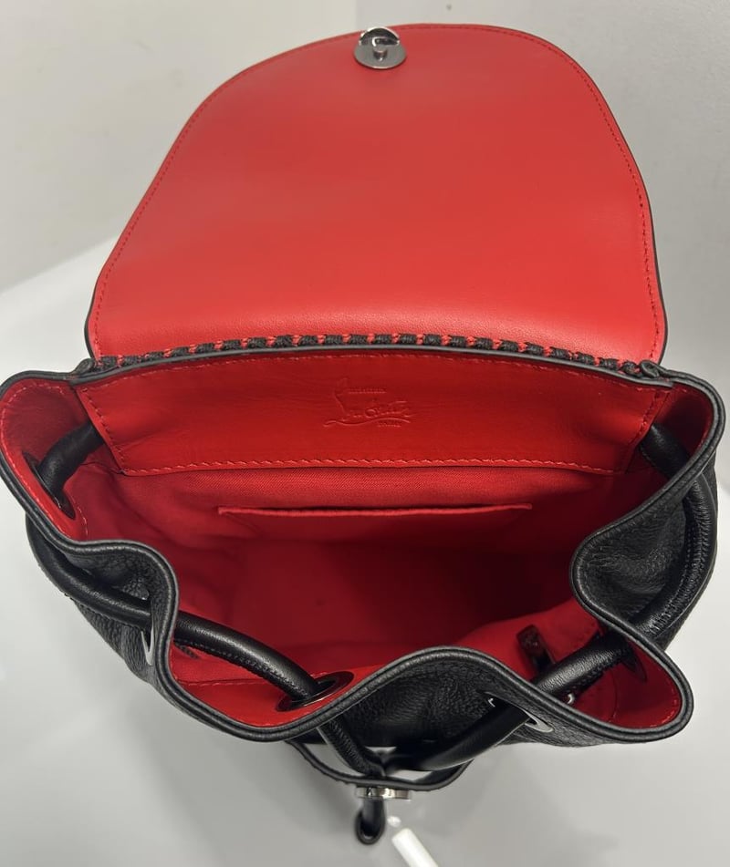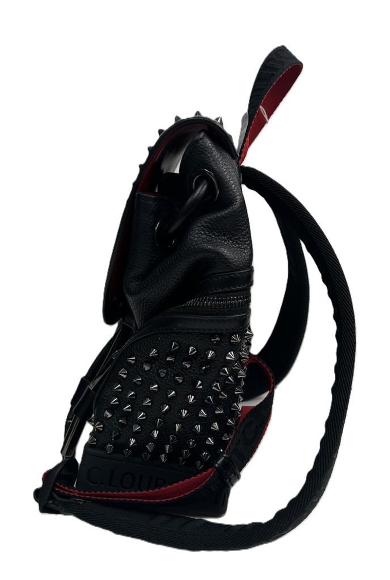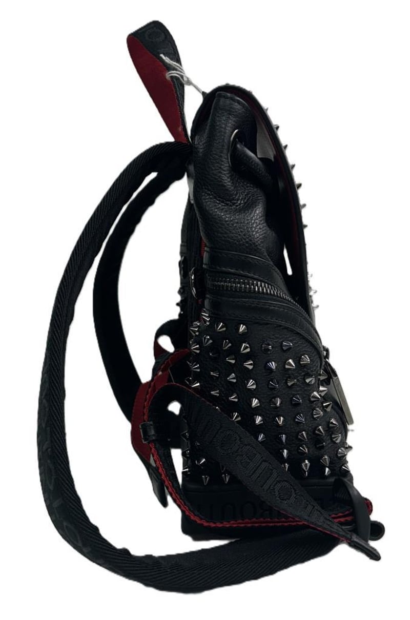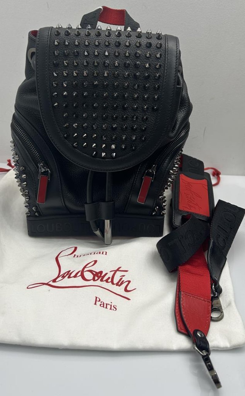 CHRISTIAN LOUBOUTIN EXPLORAFUNK MINI BACKPACK IN BLACK LEATHER WITH GUNMETAL-TONE SPIKE STUD DETAILING, SIGNATURE RED ACCENTS AND RUBBERISED BASE FEATURING EMBOSSED LOUBOUTIN LOGO. FEATURES DRAWSTRING CLOSURE WITH MAGNETIC FLAP, FRONT ZIP POCKETS, AND ADJUSTABLE LOGO-EMBROIDERED SHOULDER STRAPS. INCLUDES REMOVABLE SHOULDER STRAP AND PAPERS. MEASURES APPROXIMATELY 23 X 18 X 11 CM. MADE IN ITALY. THIS ITEM HAS BEEN PROFESSIONALLY VERIFIED AS AUTHENTIC AND COMES WITH ACCOMPANYING 3RD PARTY CERTIFICATE OF AUTHENTICITY. CONDITION 9/10 EXCELLENT PRE-OWNED CONDITION WITH MINIMAL SIGNS OF USE.