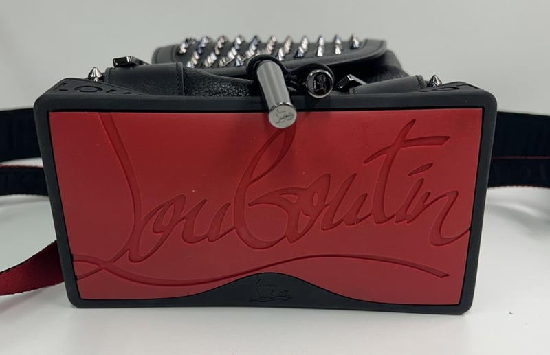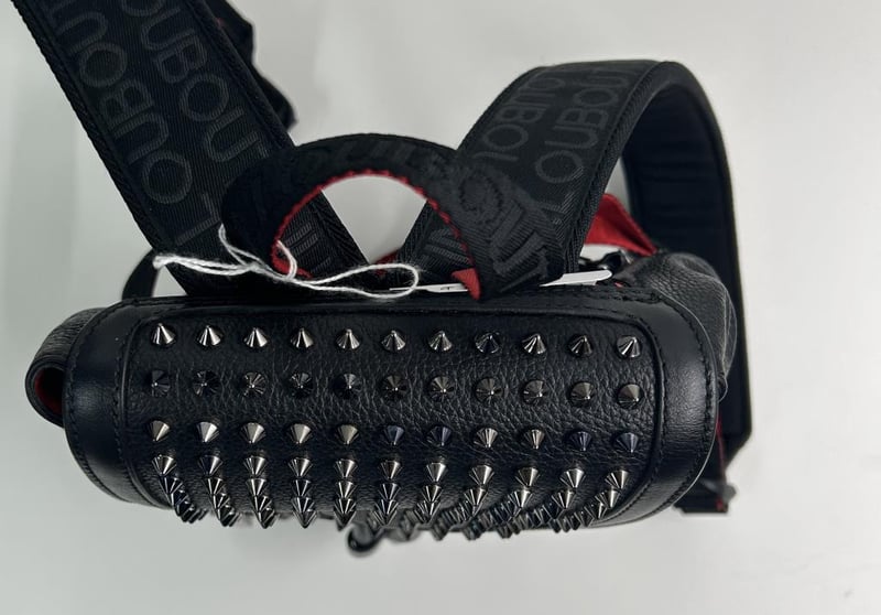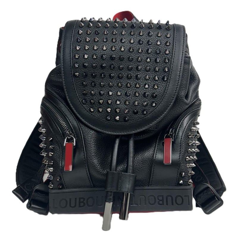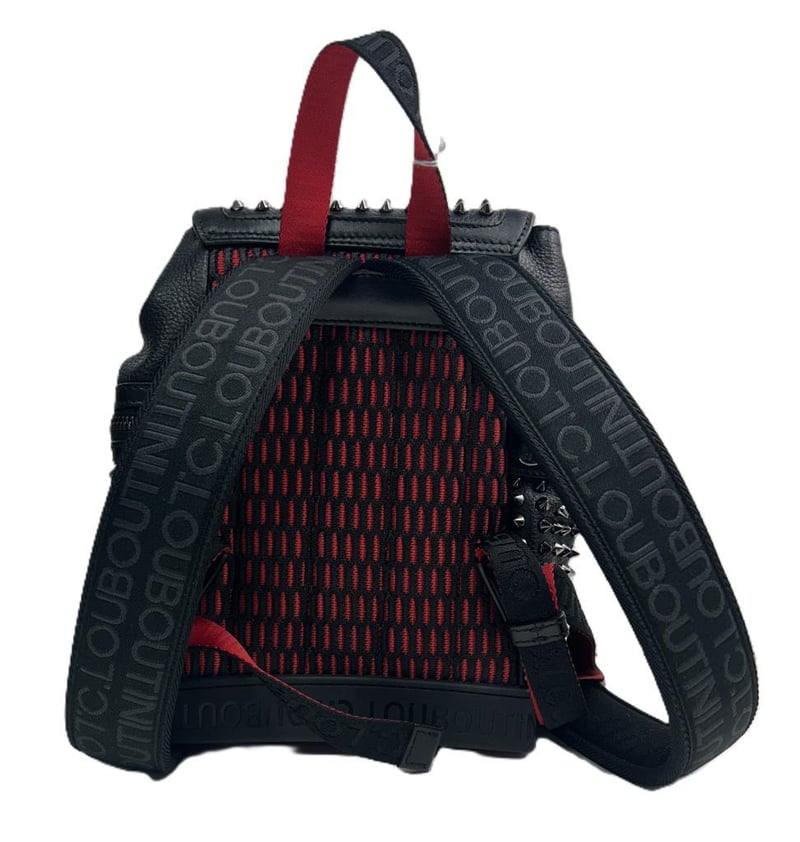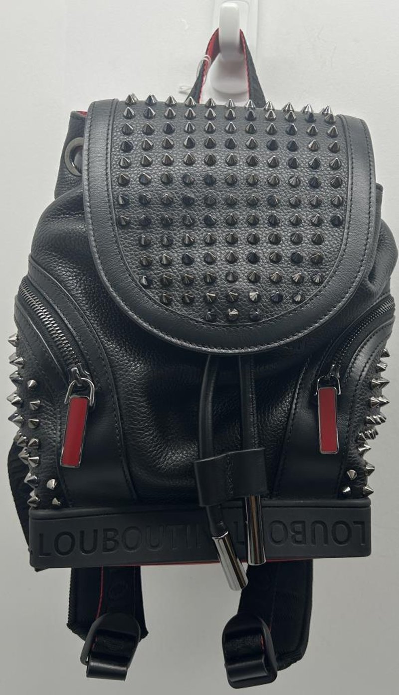 CHRISTIAN LOUBOUTIN EXPLORAFUNK MINI BACKPACK IN BLACK LEATHER WITH GUNMETAL-TONE SPIKE STUD DETAILING, SIGNATURE RED ACCENTS AND RUBBERISED BASE FEATURING EMBOSSED LOUBOUTIN LOGO. FEATURES DRAWSTRING CLOSURE WITH MAGNETIC FLAP, FRONT ZIP POCKETS, AND ADJUSTABLE LOGO-EMBROIDERED SHOULDER STRAPS. INCLUDES REMOVABLE SHOULDER STRAP AND PAPERS. MEASURES APPROXIMATELY 23 X 18 X 11 CM. MADE IN ITALY. THIS ITEM HAS BEEN PROFESSIONALLY VERIFIED AS AUTHENTIC AND COMES WITH ACCOMPANYING 3RD PARTY CERTIFICATE OF AUTHENTICITY. CONDITION 9/10 EXCELLENT PRE-OWNED CONDITION WITH MINIMAL SIGNS OF USE.