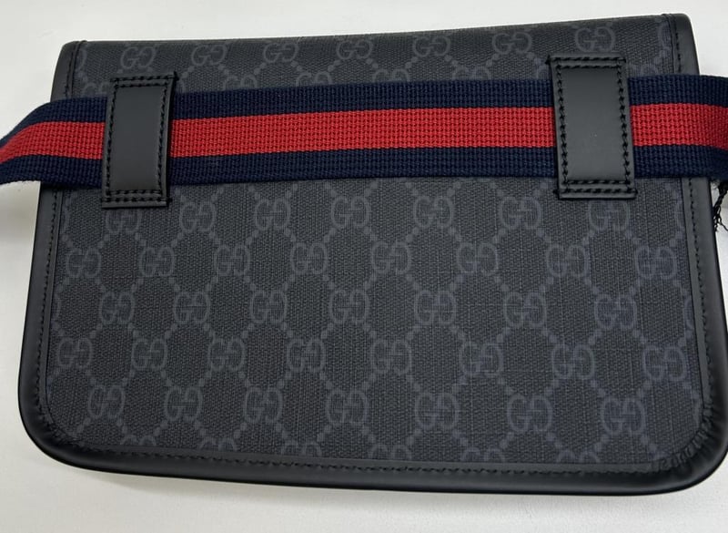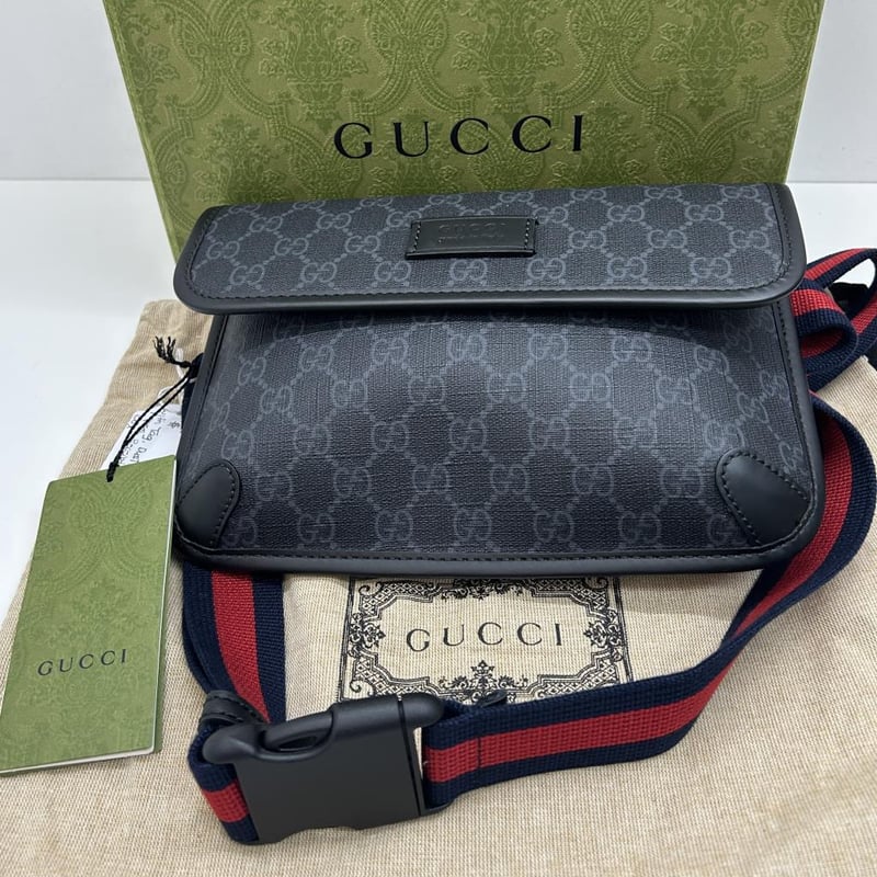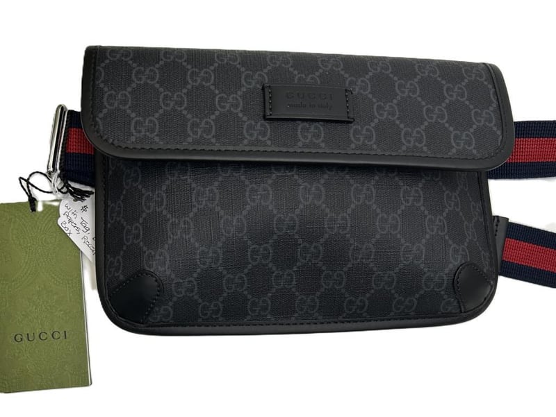 GUCCI BLACK/GREY GG SUPREME BELT BAG, BLUE/RED WEB STRIPE ADJUSTABLE BELT, GG COATED CANVAS & BLACK LEATHER TRIM, MAGNETIC CLOSURE, 24 X 16 3.5CM, MADE IN ITALY, NEW WITH TAGS, RECEIPT, BOX & DUST COVER. THIS ITEM HAS BEEN PROFESSIONALLY VERIFIED AS A GENUINE PRODUCT AND COMES WITH ACCOMPANYING 3RD PARTY CERTIFICATE OF AUTHENTICITY.