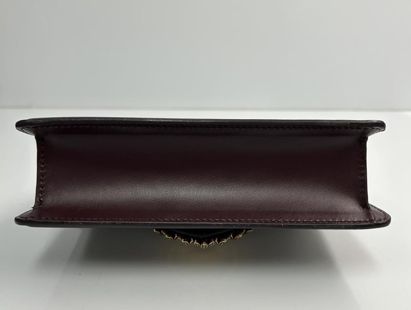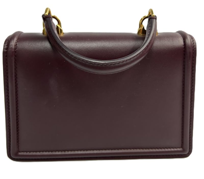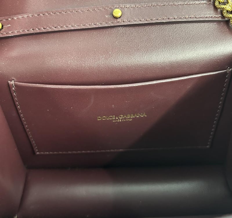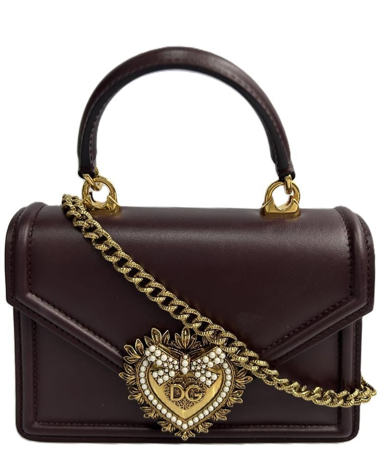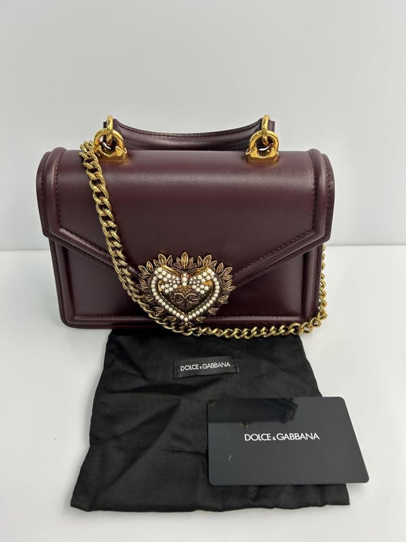 DOLCE & GABBANA DEVOTION HANDBAG, BURGUNDY LEATHER WITH GOLD-TONE HARDWARE, FOLD-OVER SNAP-LOCK CLOSURE WITH GOLD & PEARL DG HEART EMBLEM, TOP HANDLE, DETACHABLE CHAIN STRAP, LEATHER LINING, 1 SLIP POCKET, BAG MEASURES 19 X 12 X 6.0CM, MADE IN ITALY. THIS ITEM HAS BEEN PROFESSIONALLY VERIFIED AS A GENUINE PRODUCT AND COMES WITH ACCOMPANYING 3RD PARTY CERTIFICATE OF AUTHENTICITYCondition: Good - Refer To Images