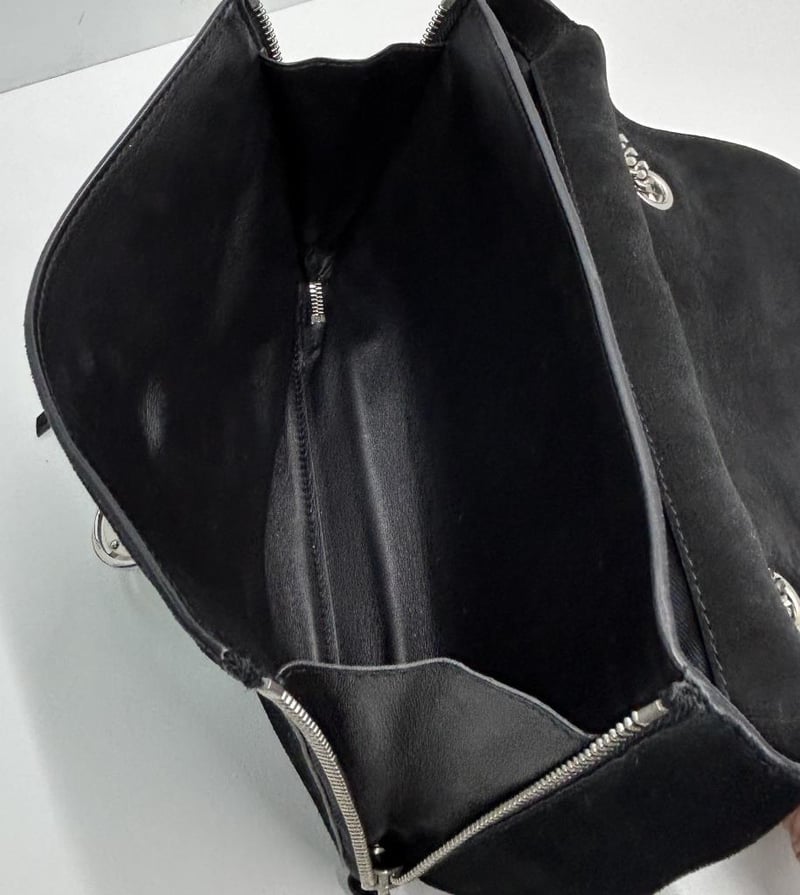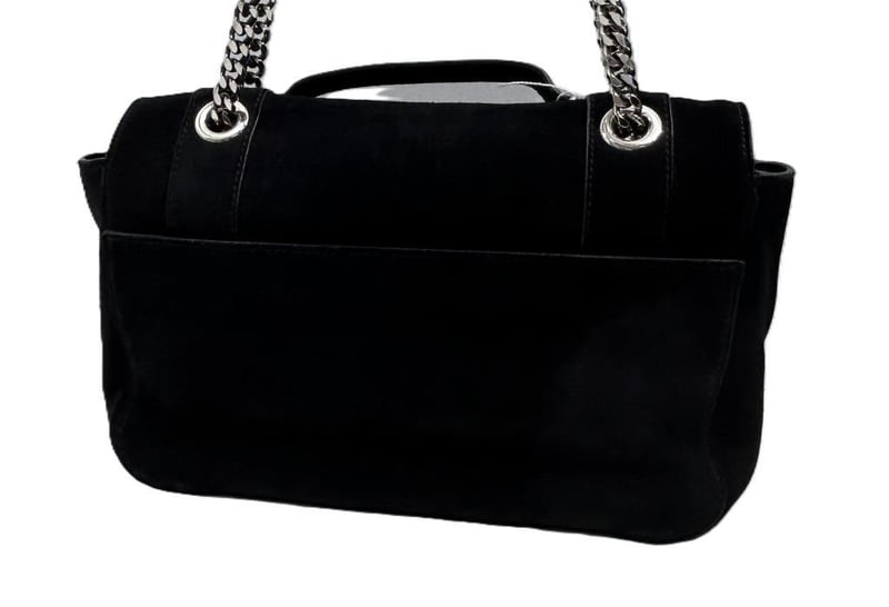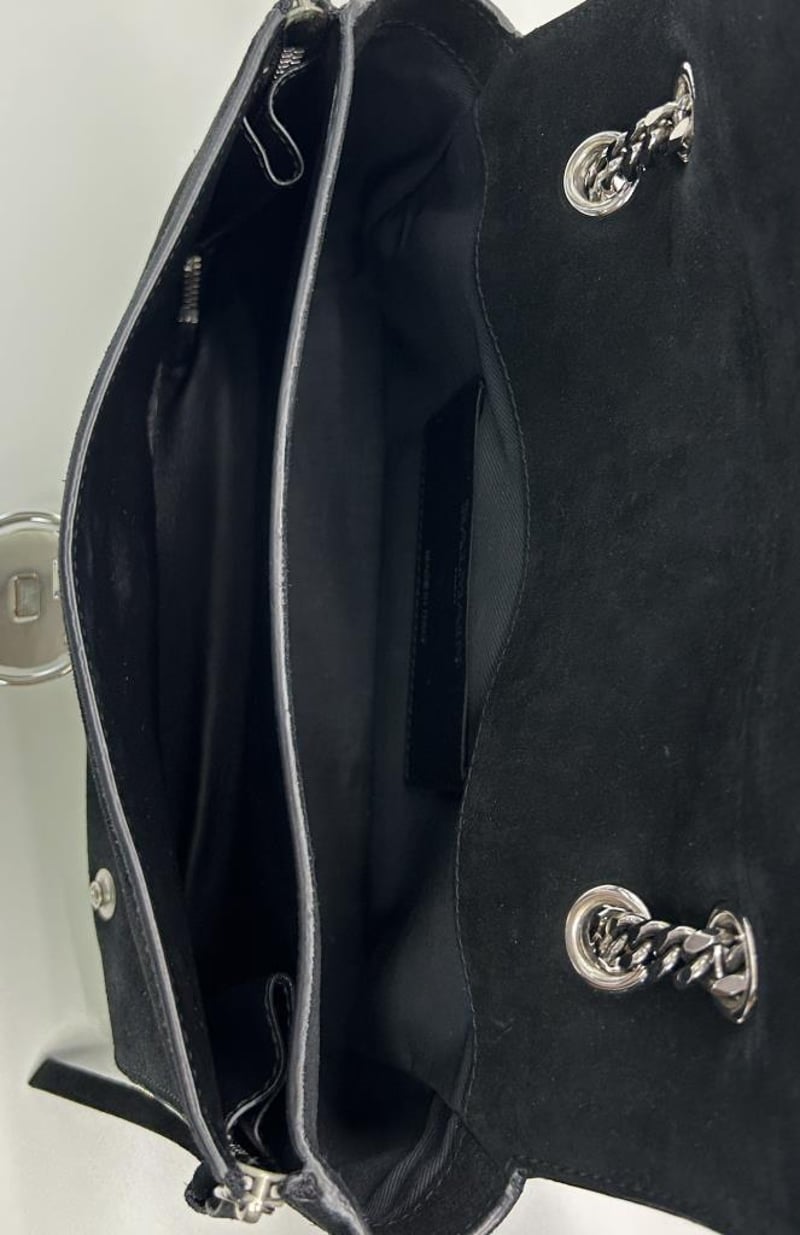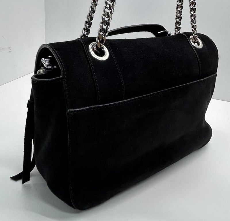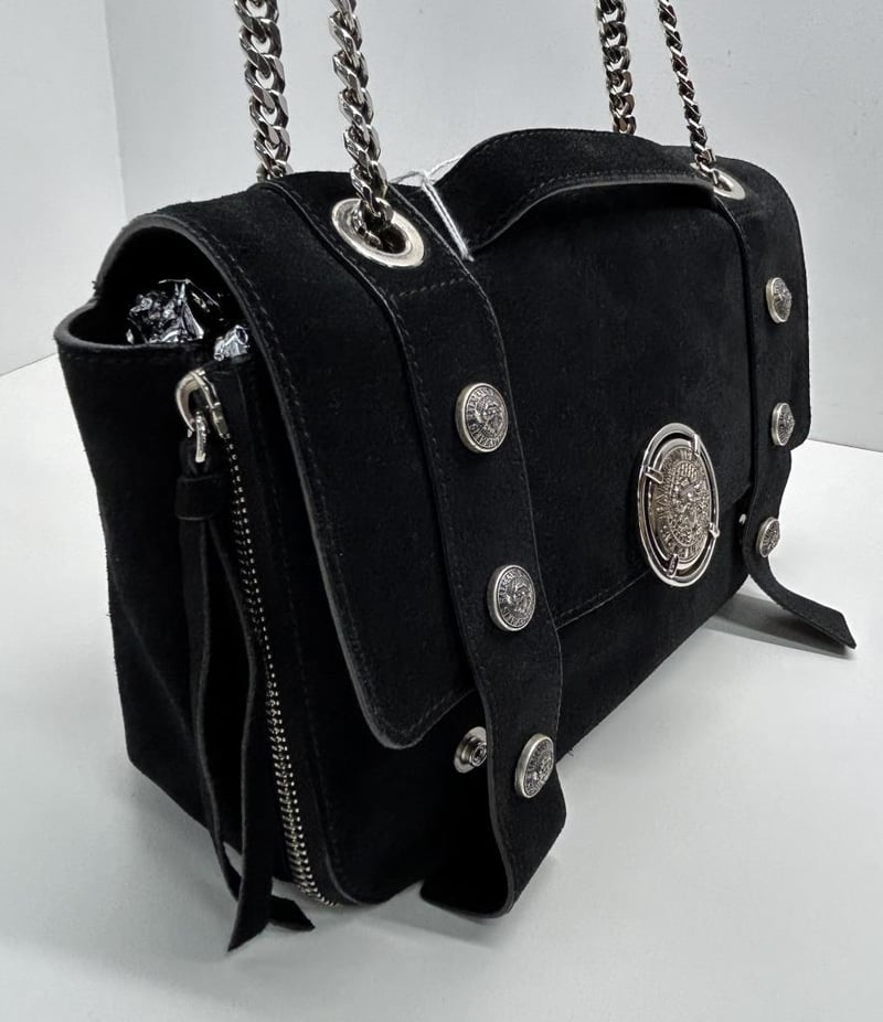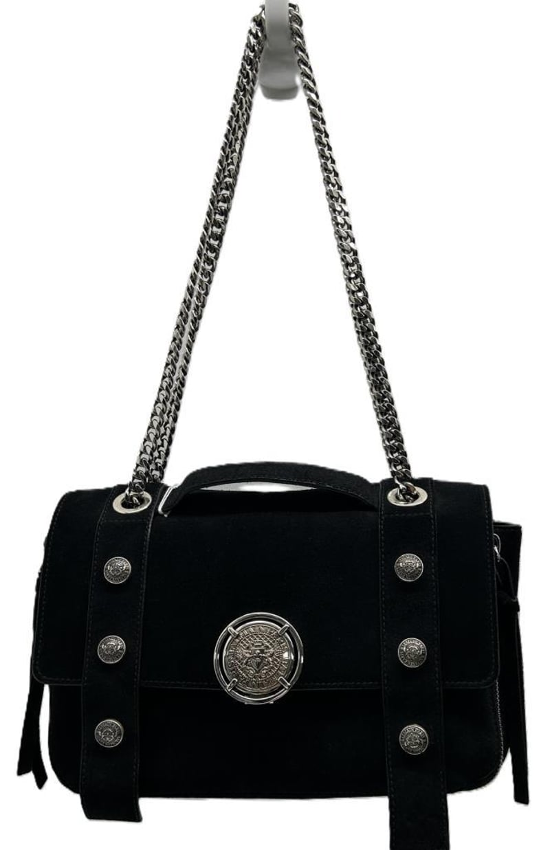 BALMAIN PARIS BLACK SUEDE LEATHER 2-WAY HANDBAG, TOP HANDLE & CHAIN SHOULDER STRAP, SILVER TONE HARDWARE, FOLD OVER PUSH LOCK CLOSURE, BACK SLIP POCKET, FRONT EXPANDABLE ZIP COMPARTMENT, BAG MEASURES 25 X 15 X 9CM, MADE IN ITALY, INCLUDES DUST COVER. THIS ITEM HAS BEEN PROFESSIONALLY VERIFIED AS A GENUINE PRODUCT AND COMES WITH ACCOMPANYING 3RD PARTY CERTIFICATE OF AUTHENTICITY Condition: Good - Refer To Images