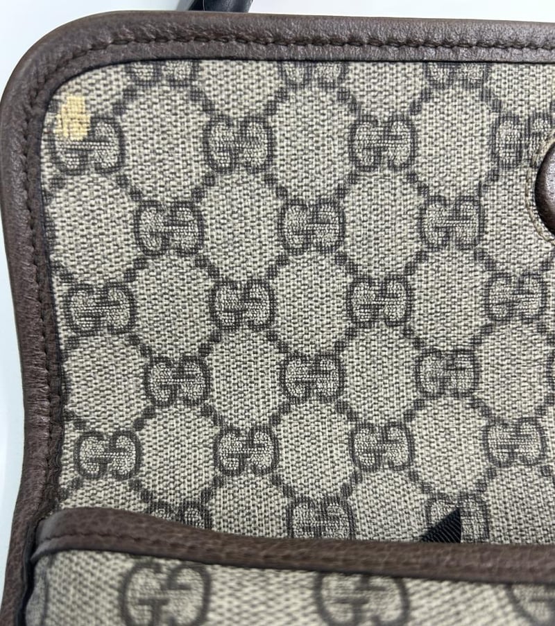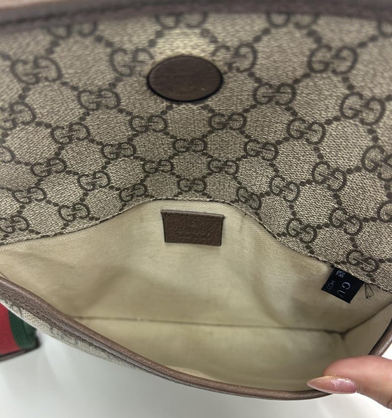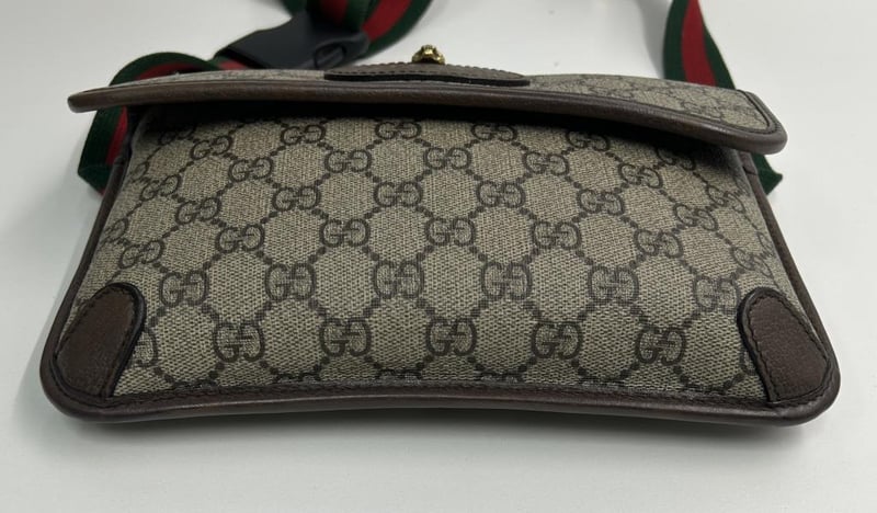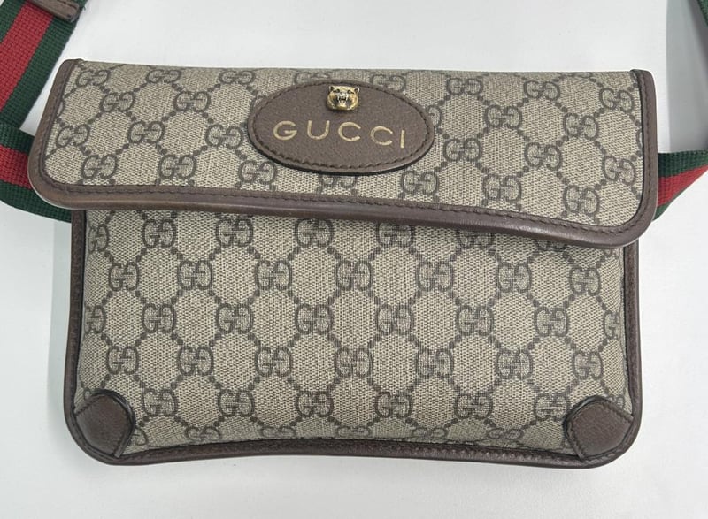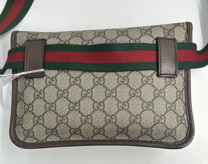 GUCCI VINTAGE NEO MEN'S WEB STRIPE BELT BAG, COATED CANVAS WITH BROWN LEATHER TRIM, MAGNETIC CLOSURE, GREEN & RED ADJUSTABLE BELT, BEIGE LINING, BAG MEASURES 26 X 16 XX 2.5CM, MADE IN ITALY, INCLUDES DUST COVER. NB; MARK ON INSIDE FLAP - SEE PHOTOS THIS ITEM HAS BEEN PROFESSIONALLY VERIFIED AS A GENUINE PRODUCT AND COMES WITH ACCOMPANYING 3RD PARTY CERTIFICATE OF AUTHENTICITYCondition: Good - Refer To Images