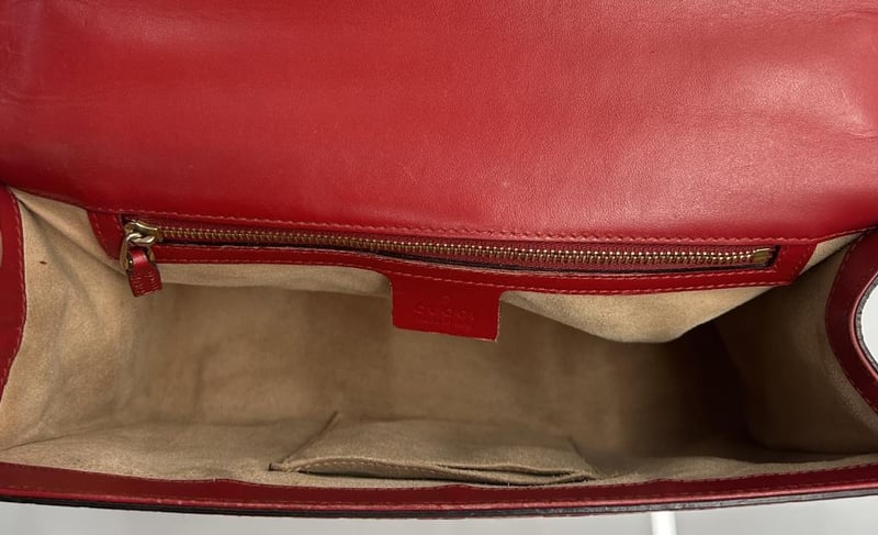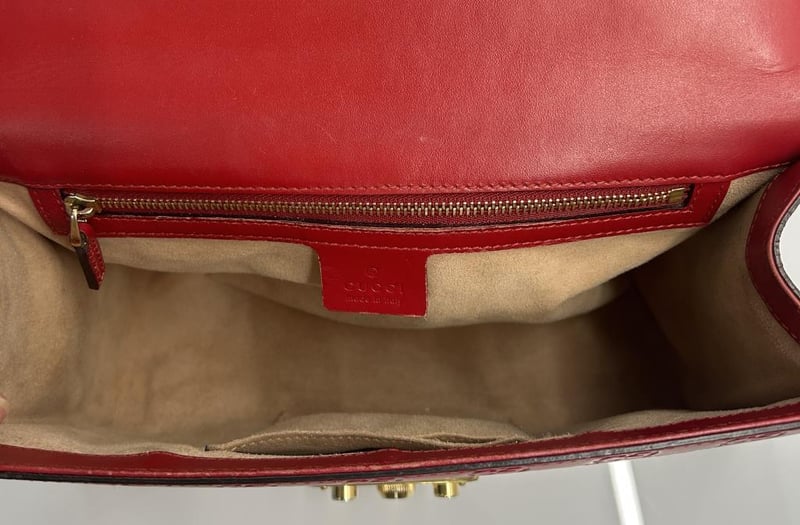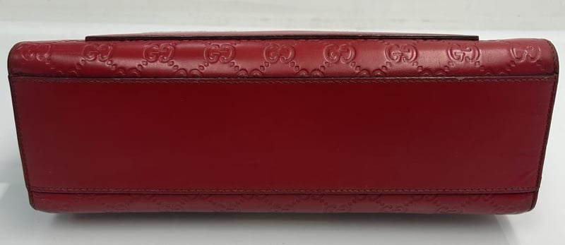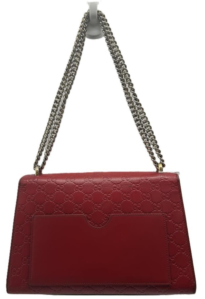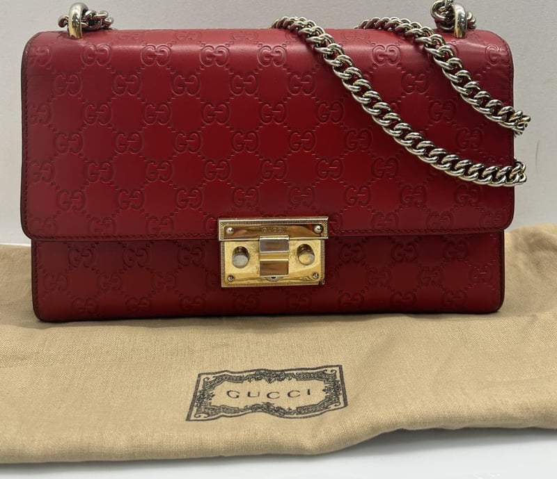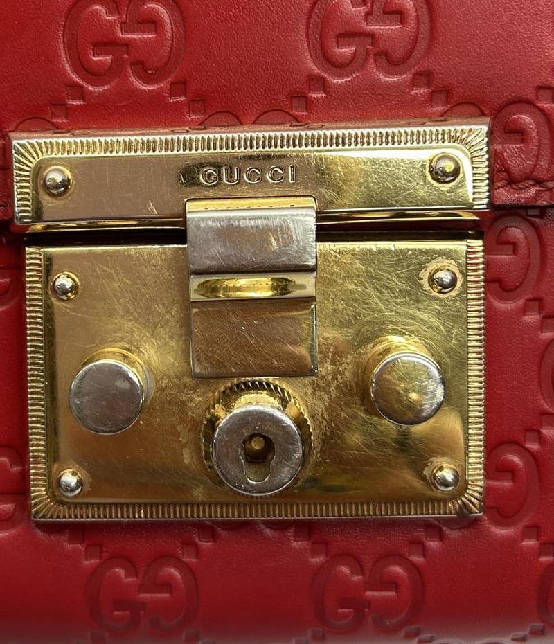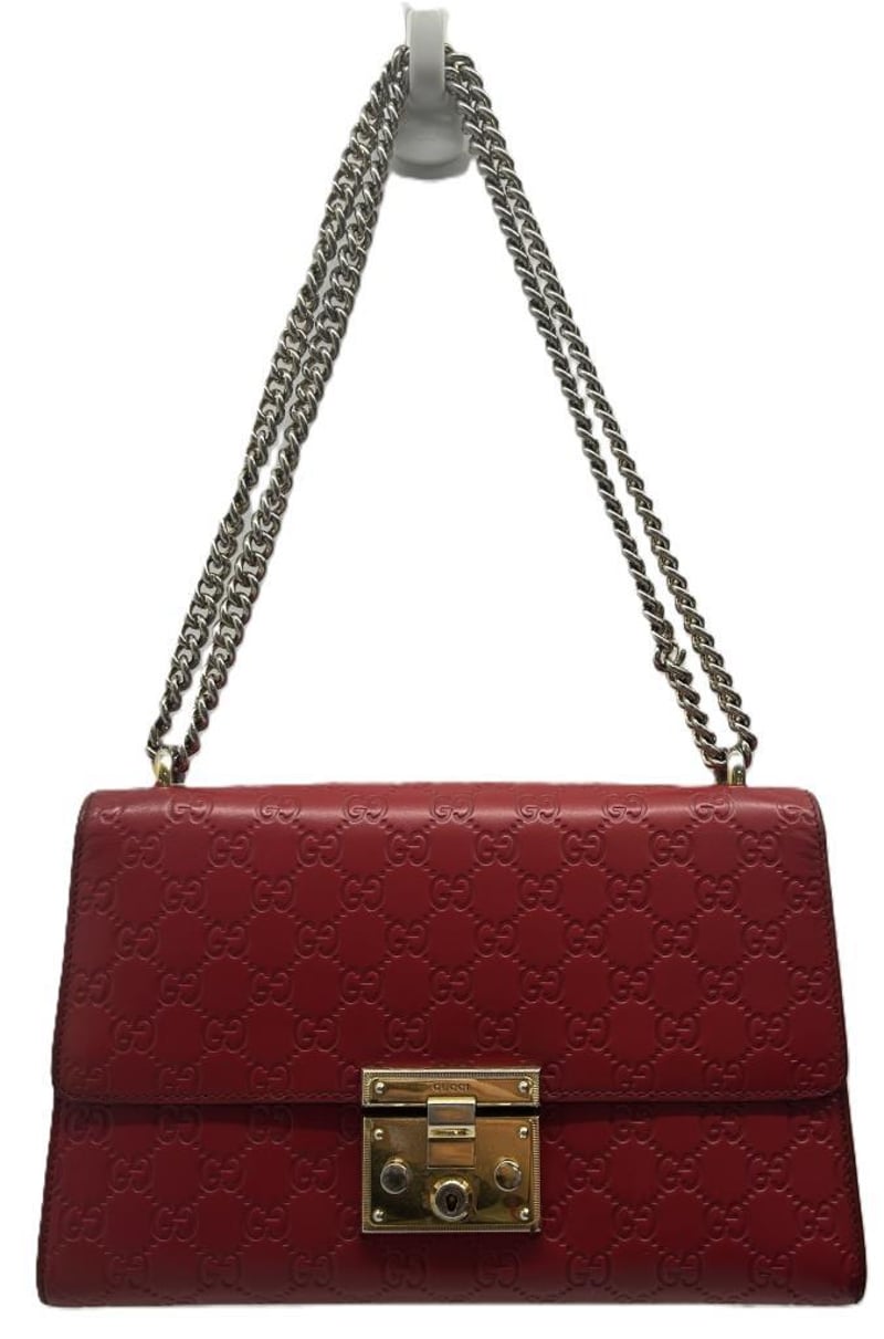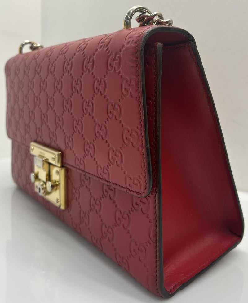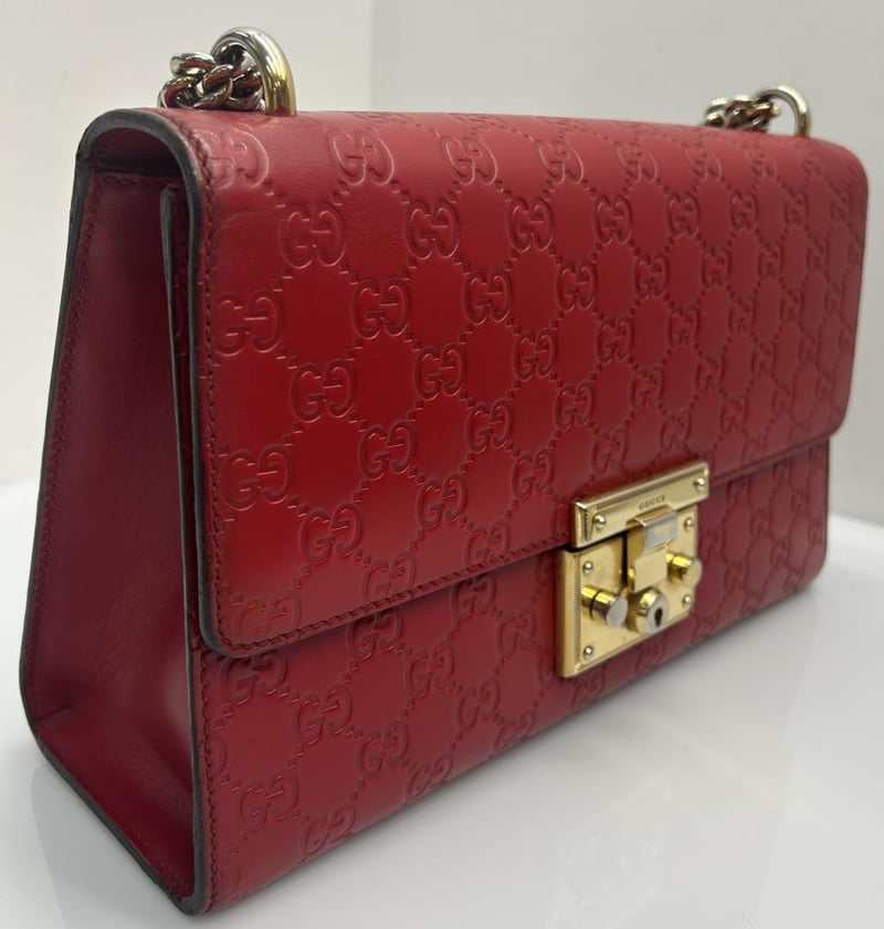 GUCCI GUCCISSIMA PADLOCK RED EMBOSSED LEATHER SHOULDER BAG, GOLD-TONE HARDWARE, CHAIN SHOULDER STRAP, FRONT FLAP WITH ENGRAVED PADLOCK CLOSURE, BEIGE CANVAS INTERIOR WITH SINGLE SLIP POCKET, CRAFTED IN RED GUCCISSIMA CALFSKIN LEATHER, INCLUDES DUST COVER, BAG MEASURES 25 X 17 X 8 CM, MADE IN ITALY. THIS ITEM HAS BEEN PROFESSIONALLY VERIFIED AS A GENUINE PRODUCT AND COMES WITH ACCOMPANYING 3RD PARTY CERTIFICATE OF AUTHENTICITY, CONDITION 8.5/10 WITH MINOR DISCOLOURATION AND LIGHT WEAR TO HARDWARE.