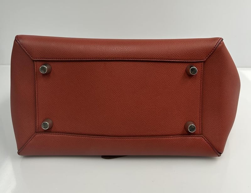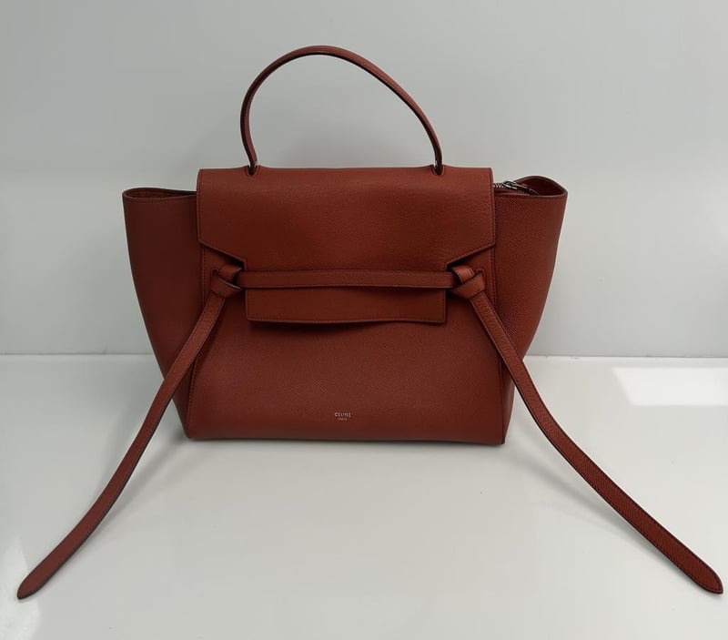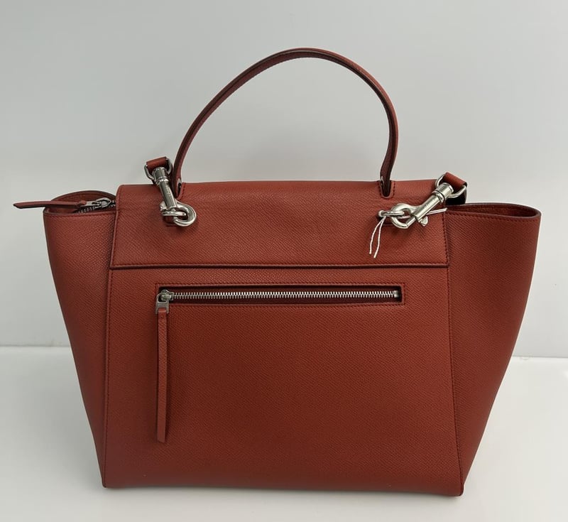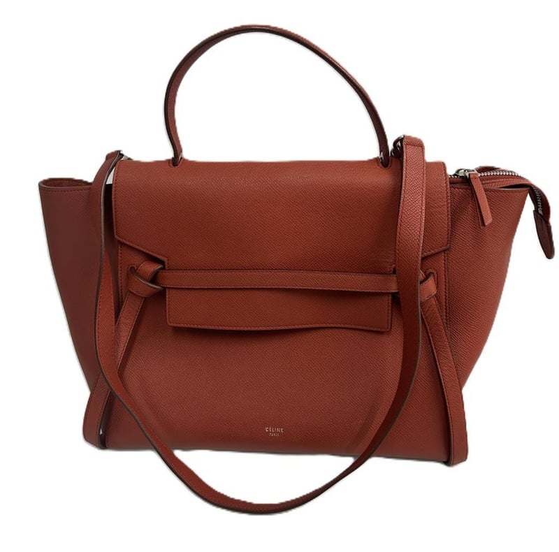 CELINE RUST CALFSKIN LEATHER BELT SATCHEL, SILVER-TONE HARDWARE, SINGLE TOP HANDLE, BACK ZIP POCKET, FOLD OVER FLAP & TOP ZIP CLOSURE, RUST SUEDE LEATHER LINING, 2 SLIP POCKETS, BAG MEASURES 30 X 20 X17CM, MADE IN ITALY. THIS ITEM HAS BEEN PROFESSIONALLY VERIFIED AS A GENUINE PRODUCT AND COMES WITH ACCOMPANYING 3RD PARTY CERTIFICATE OF AUTHENTICITYCondition: Good - Refer To Images