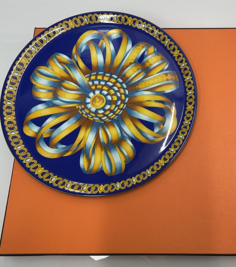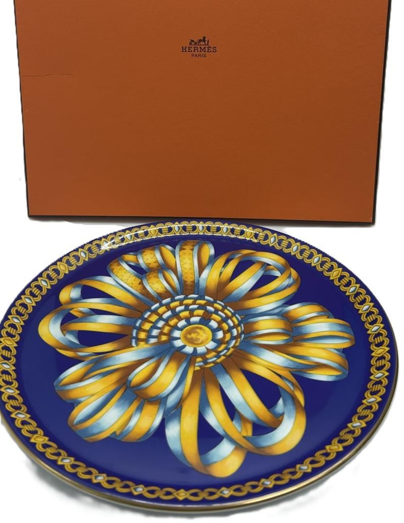 HERMÈS MOSAIQUE AU 24 BLEU DESSERT PLATE, MEASURES 30CM DIAMETER, FEATURING THE ICONIC MOSAIQUE AU 24 DESIGN IN RICH COBALT BLUE, GOLD, AND TURQUOISE. INSPIRED BY THE MOSAIC FLOORS OF HERMÈS’ FLAGSHIP STORE AT 24 FAUBOURG SAINT-HONORÉ, IT SHOWCASES INTRICATE RIBBON-STYLE DETAILING AND A GOLD-ACCENTED BORDER, MADE IN FRANCE. INCLUDES SIGNATURE HERMÈS BOX.