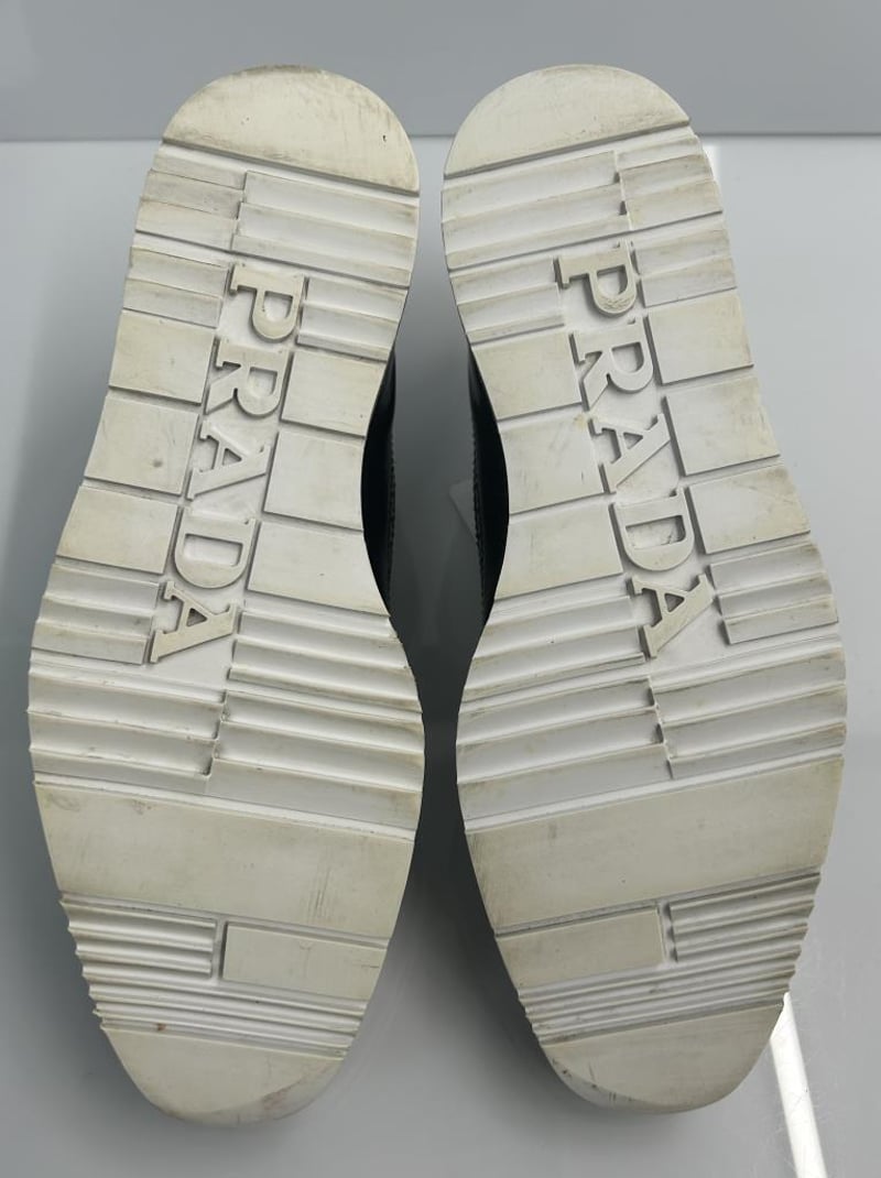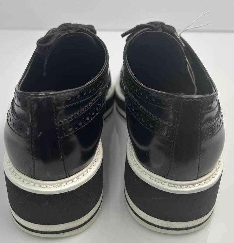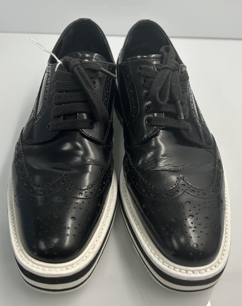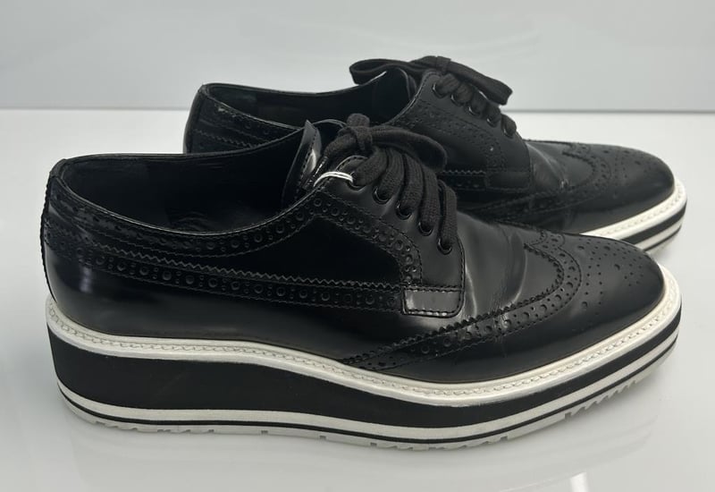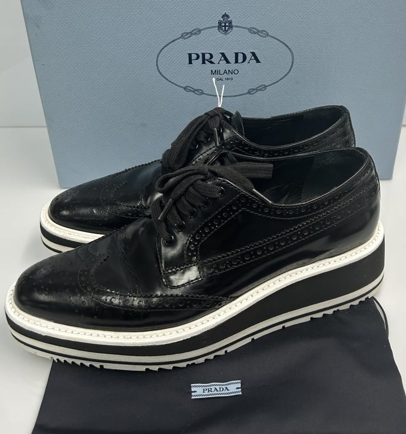 PRADA BLACK PATENT LEATHER PLATFORM BROGUES FEATURING WINGTIP DETAILING, LACE-UP FRONT, AND CONTRASTING WHITE STACKED RUBBER SOLE WITH BOLD PRADA LOGO UNDERSOLE. INCLUDES ORIGINAL BOX AND DUST BAG. MADE IN ITALY. SIZE 37. EXCELLENT PRE-OWNED CONDITION WITH LIGHT SIGNS OF WEAR.