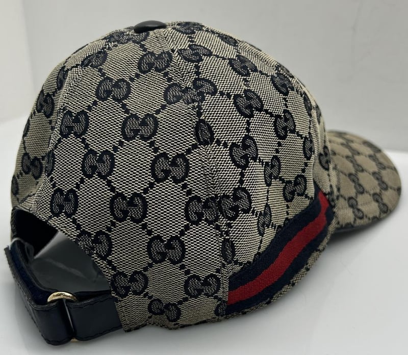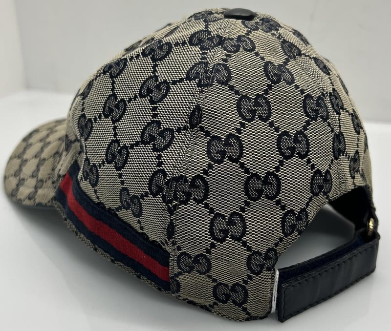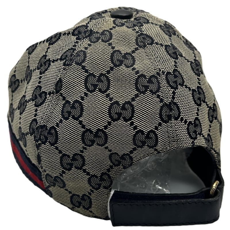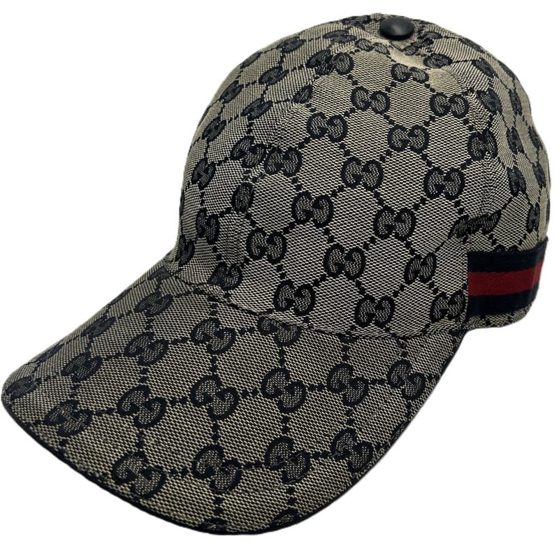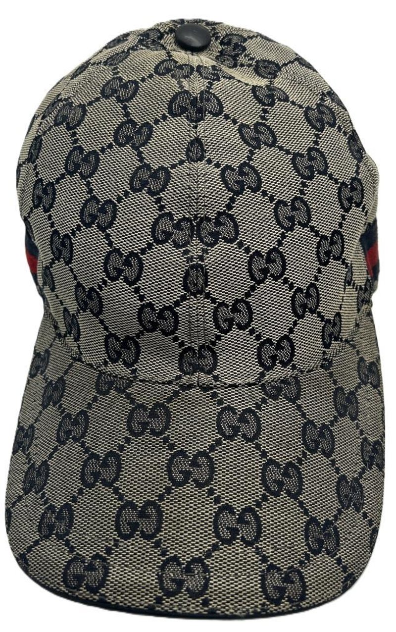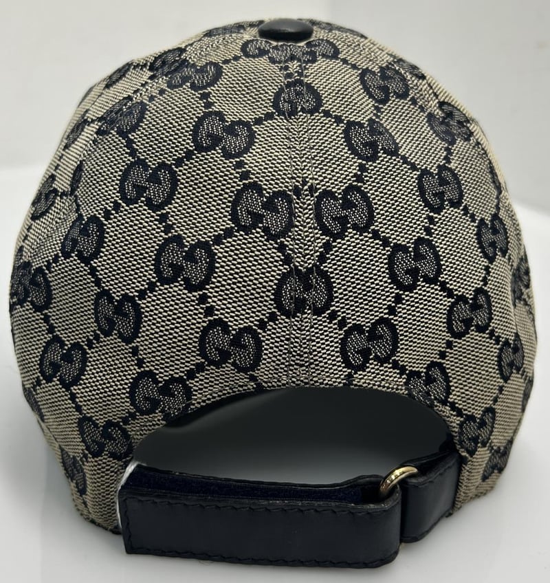 GUCCI GG SUPREME CANVAS BASEBALL CAP, CRAFTED FROM SIGNATURE BEIGE GG SUPREME CANVAS WITH BLACK INTERLOCKING GG MOTIF THROUGHOUT. FEATURES A CURVED BRIM, SIGNATURE BLUE AND RED WEB STRIPE DETAIL AT THE SIDES, AND ADJUSTABLE BLACK LEATHER STRAP AT THE BACK. MADE IN ITALY, SIZE S. Condition: Good - Refer To Images