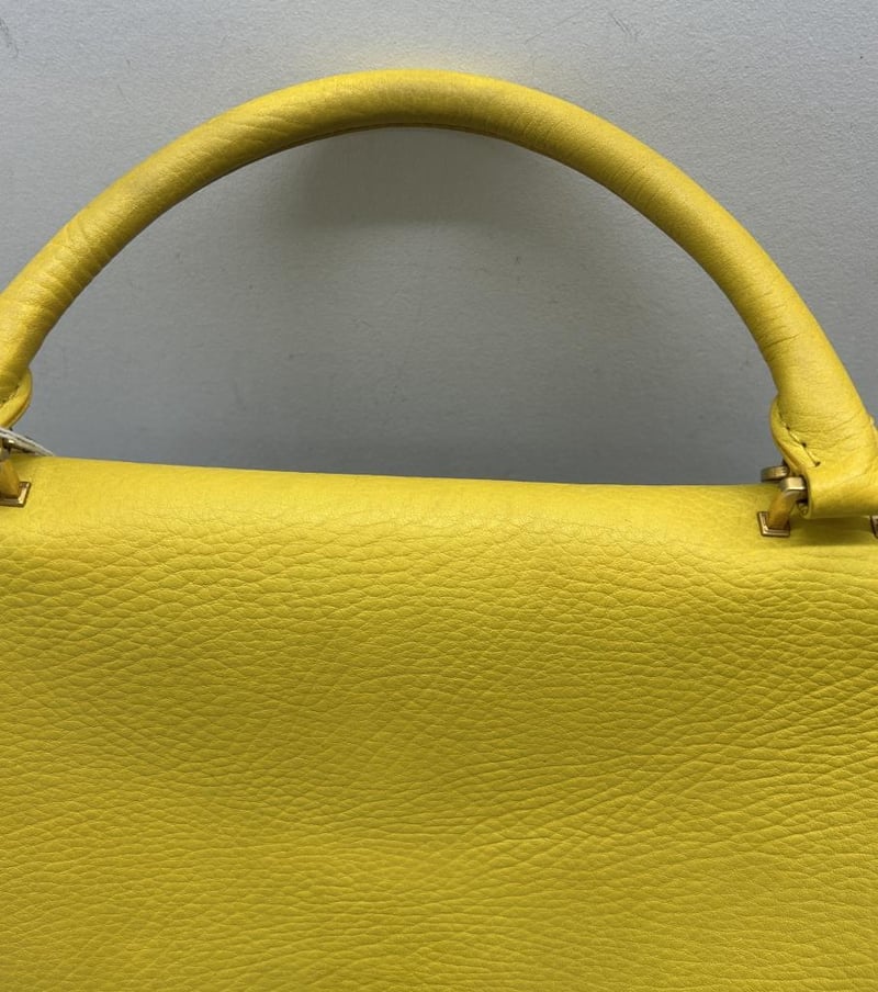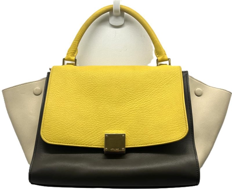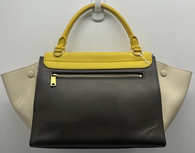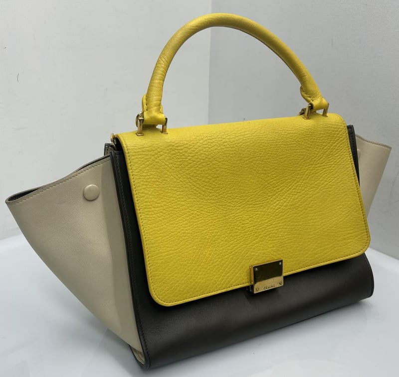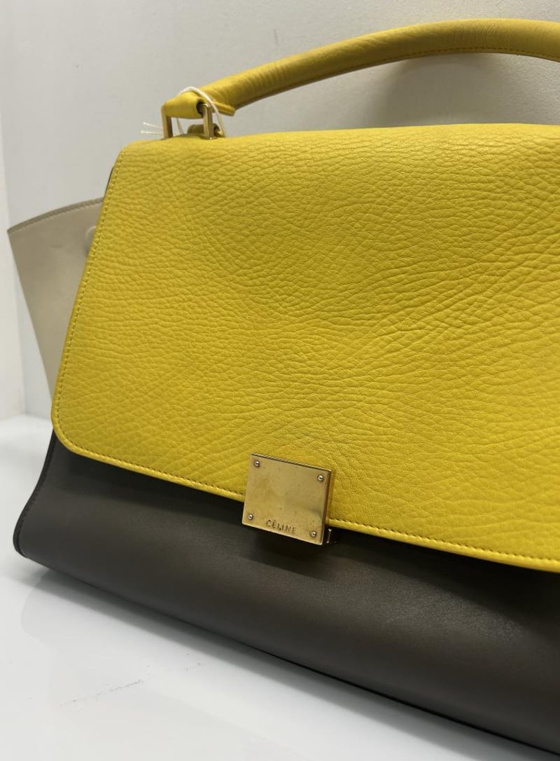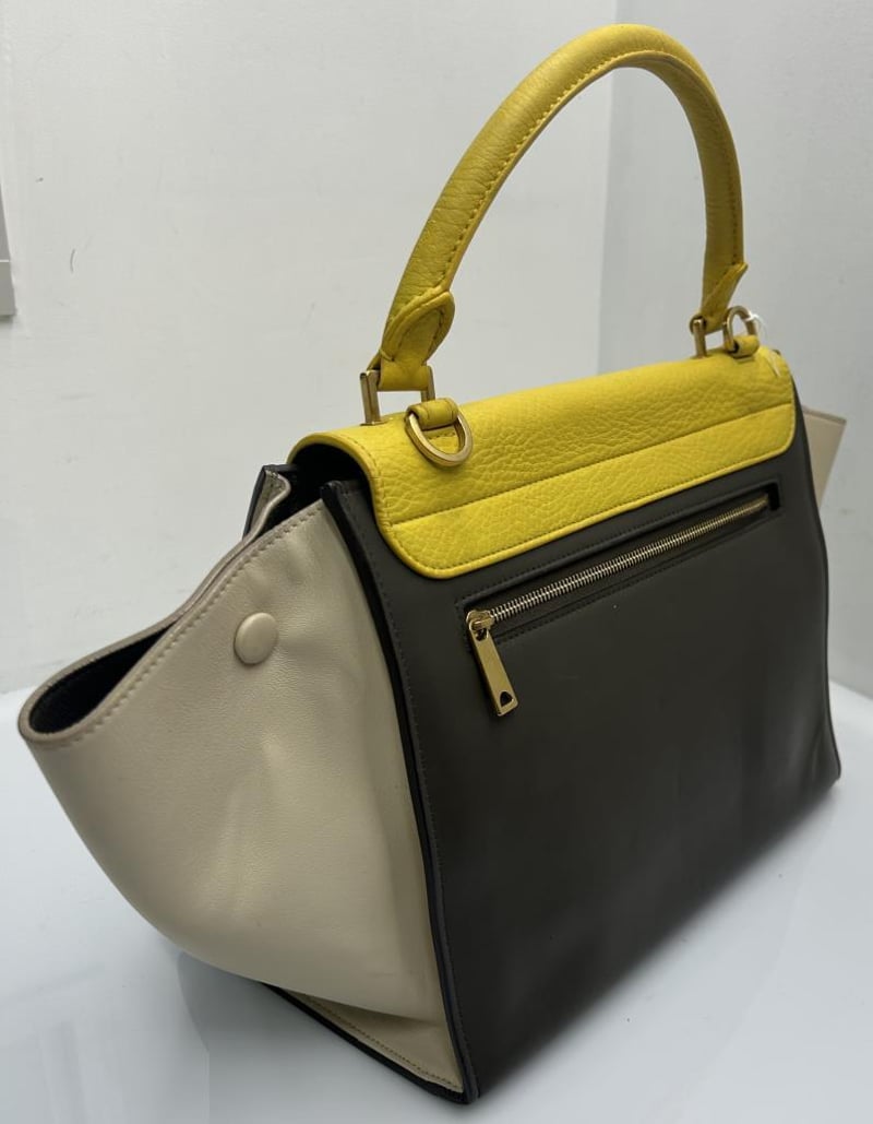 CELINE TRAPEZE TRI COLOUR HANDBAG, YELLOW, BEIGE & KHAKI COWHIDE LEATHER, GOLD-TONE HARDWARE, SIGNATURE FLARED SIDE WINGS, BACK SLIP POCKET, TOP HANDLE, TOP ZIP WITH FOLD OVER FLAP AND PUSH LOCK CLOSURE, 2 FLAT POCKETS, BAG MEASURES 26.5 X 19.5 X 16.5CM, MADE IN ITALY, THIS ITEM HAS BEEN PROFESSIONALLY VERIFIED AS A GENUINE PRODUCT AND COMES WITH ACCOMPANYING 3RD PARTY CERTIFICATE OF AUTHENTICITY