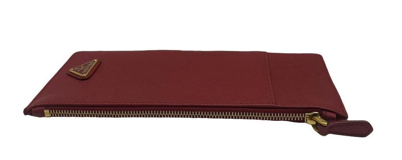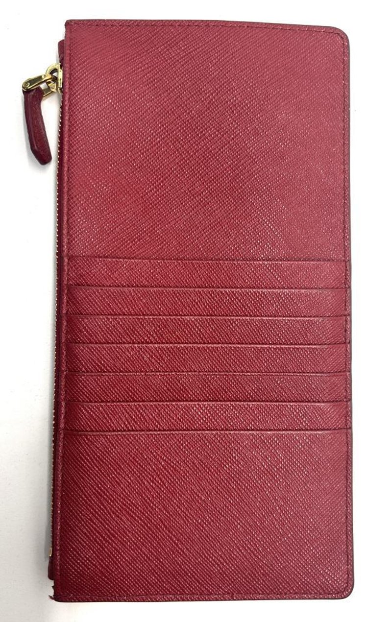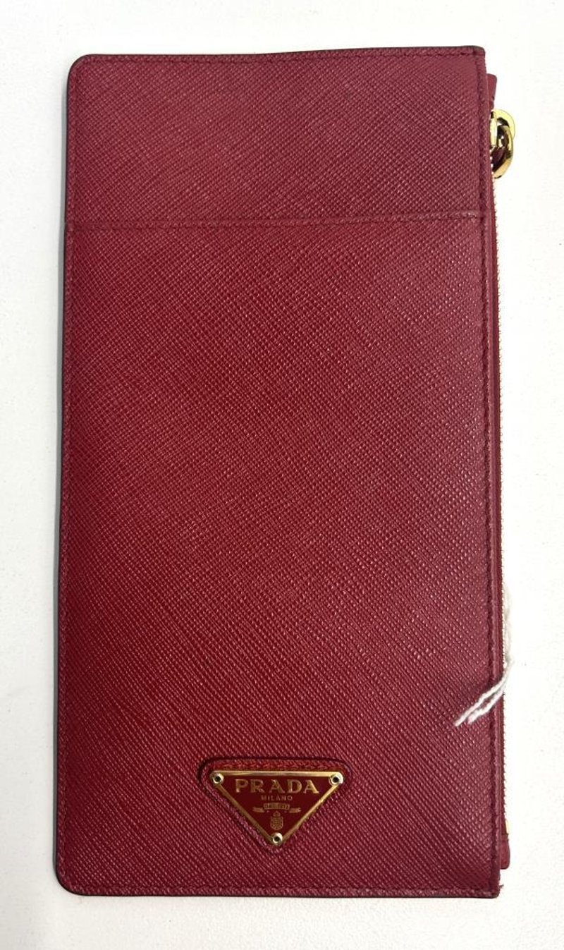 PRADA RED SAFFANO LEATHER LONG WALLET/DOCUMENT HOLDER, RED & GOLD-TONE ENAMEL PLAQUE SIGNATURE LOGO, 6 CARD HOLDERS, FRONT SLIP POCKET, ZIP POCKET, MEASURES 21 X 11CM, MADE IN ITALY. THIS ITEM HAS BEEN PROFESSIONALLY VERIFIED AS A GENUINE PRODUCT AND COMES WITH ACCOMPANYING 3RD PARTY CERTIFICATE OF AUTHENTICITY Condition: Good - Refer To Images
