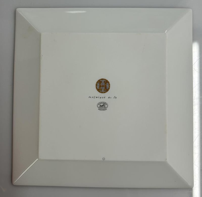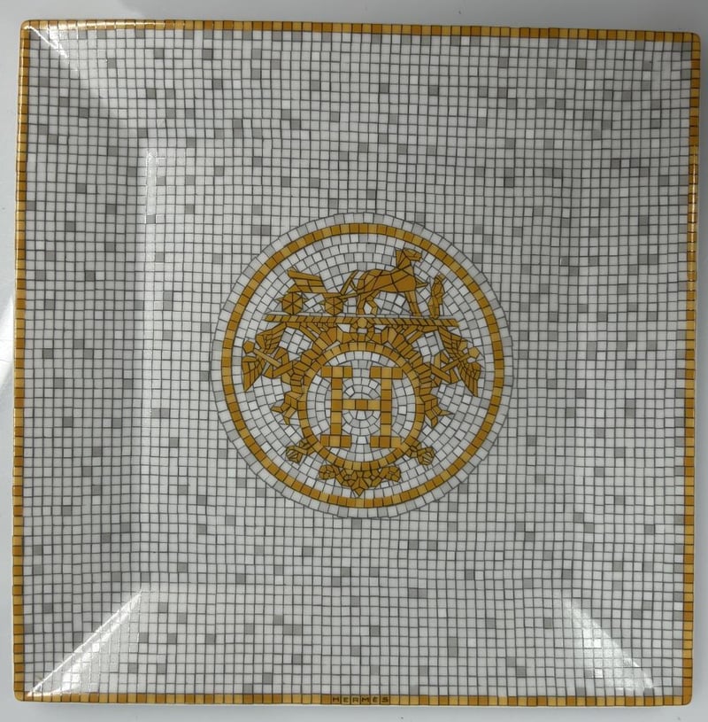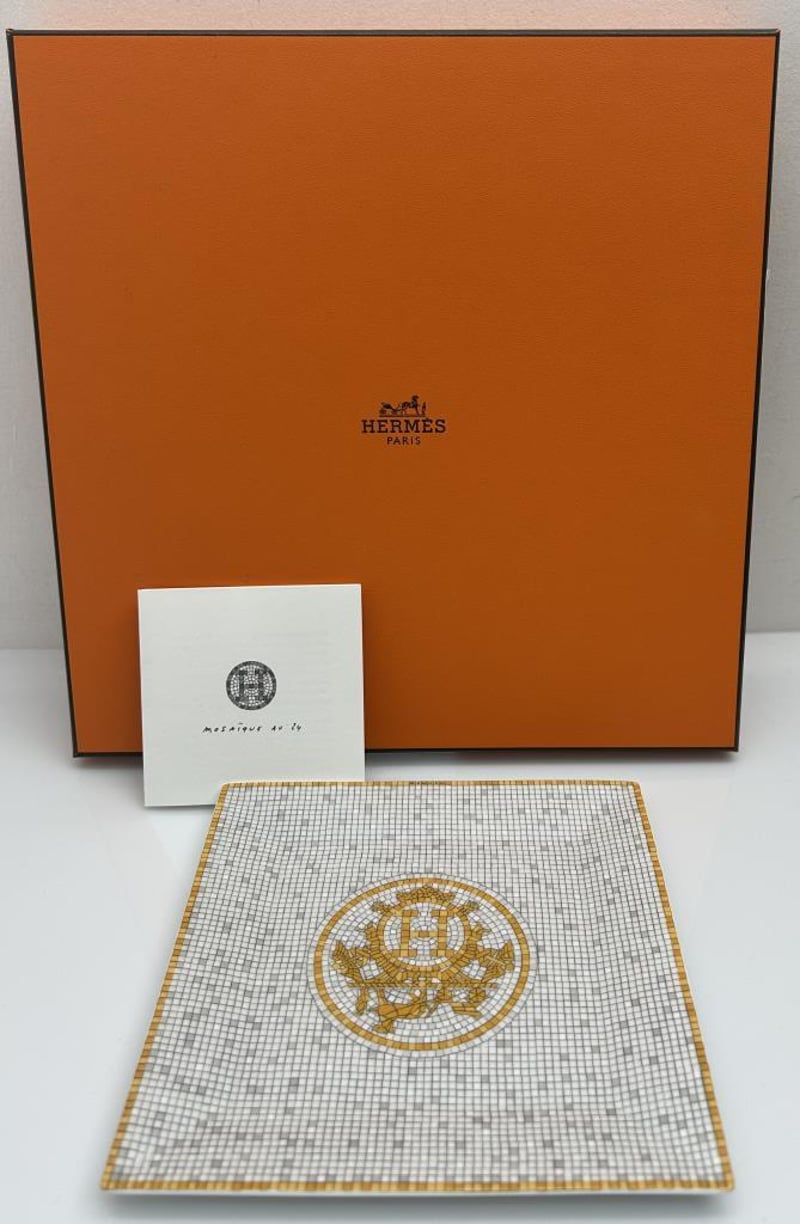 HERMES MOSAIQUE AU 24 SMALL PORCELAIN TRAY IN SIGNATURE GOLD MOSAIC DESIGN, INSPIRED BY THE ICONIC FLOOR PATTERN OF THE HERMÈS FLAGSHIP STORE AT 24 RUE DU FAUBOURG SAINT-HONORÉ, PARIS. CRAFTED FROM FINE LIMOGES PORCELAIN WITH A REFINED GEOMETRIC MOTIF AND GILT DETAILING, MEASURES 15 X 15CM, MADE IN FRANCE, INCLUDES ORIGINAL HERMÈS BOX AND BOOKLET.
