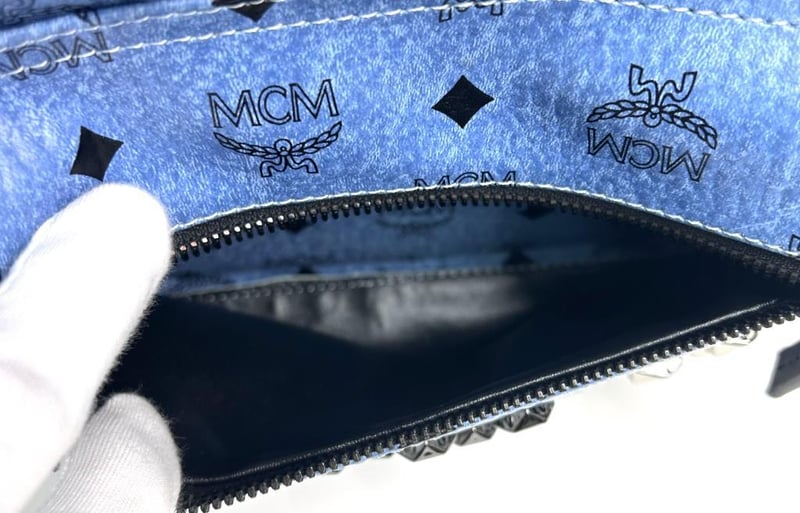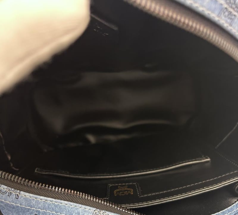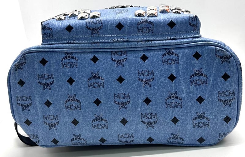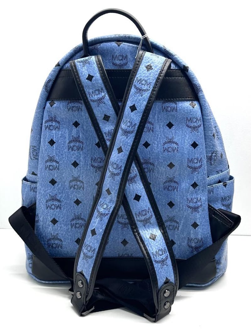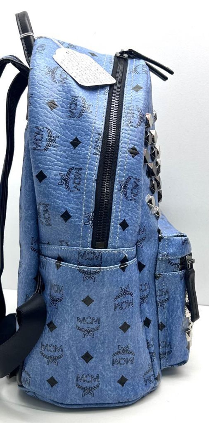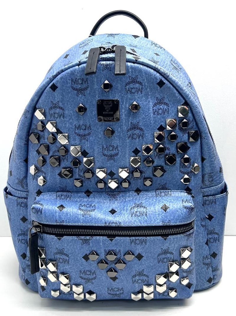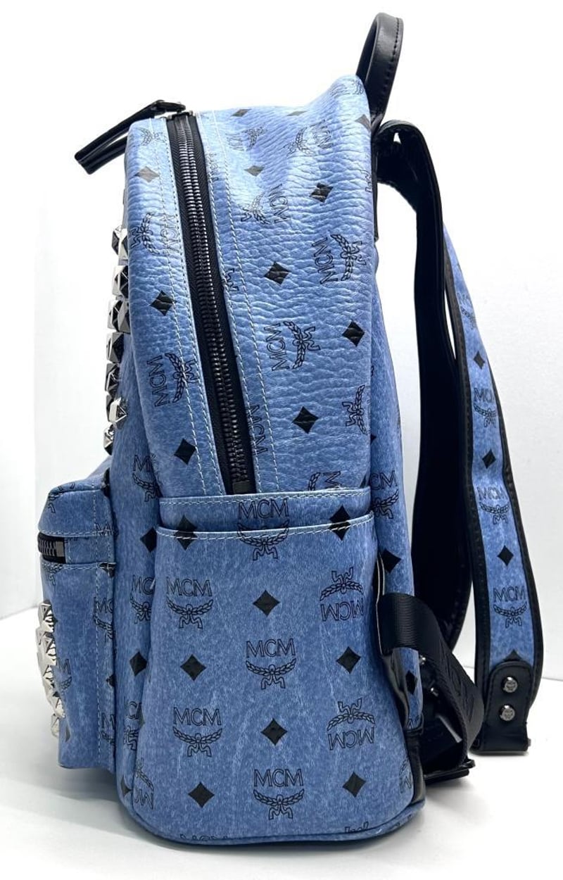 MCM VISETOS STUDDED STARK M BLUE/BLACK BACKPACK, MCM LOGO PRINT COATED CANVAS, MCM MÜNCHEN BRONZE PLAQUE AT FRONT A2137, FRONT ZIP POCKET, ZIP AROUND TOP CLOSURE, TOP HANDLE, SILVER TONE & BRONZE STUDS, SLIP POCKET AT EACH SIDE , ADJUSTABLE BACK PADDED SHOULDER STRAPS, 2 X INTERNAL SLIP POCKETS, MEASURES 33 X 15 X 38CM. THIS ITEM HAS BEEN PROFESSIONALLY VERIFIED AS A GENUINE PRODUCT AND COMES WITH ACCOMPANYING 3RD PARTY CERTIFICATE OF AUTHENTICITY
