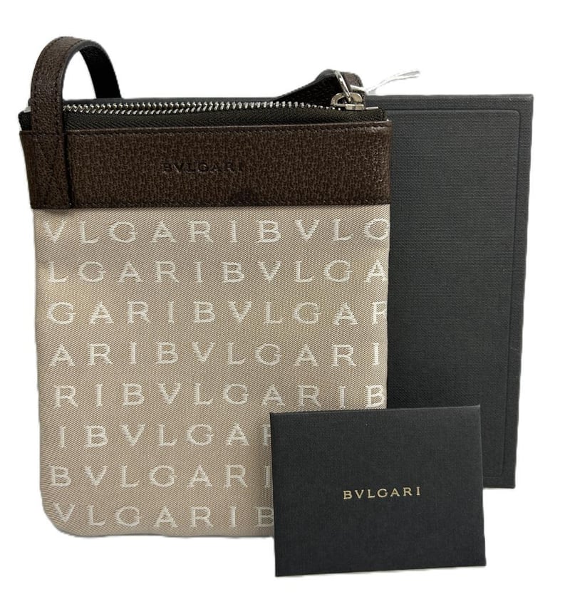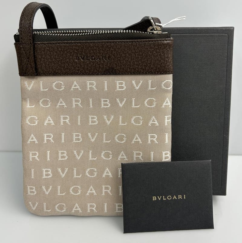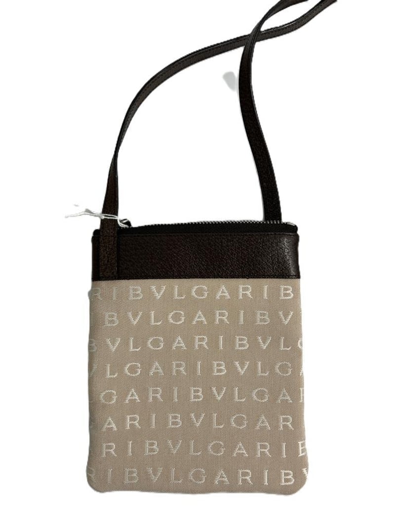 BVLGARI MANIA CROSSBODY BAG, BEIGE BVLGARI PRINTED CANVAS WITH BROWN LEATHER TRIM AND STRAP, ZIP CLOSURE, BAG MEASURES 14.5 X 18CM, MADE IN ITALY, INCLUDES BOX.