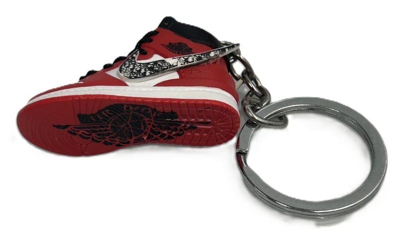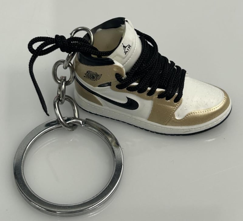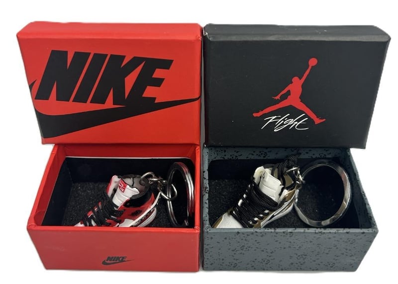SET OF TWO SNEAKER KEYCHAINS IN COLLECTIBLE BOXES — NIKE RED/WHITE DESIGN AND AIR JORDAN GOLD/WHITE DESIGN. EACH PRESENTED IN BRANDED MINI SHOEBOX PACKAGING WITH FOAM INSERTS.