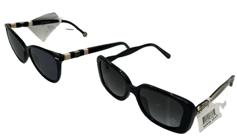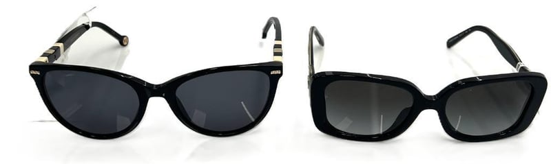 COACH AND CAROLINA HERRERA SUNGLASSES BUNDLE FEATURING TWO PAIRS OF LUXURY DESIGNER EYEWEAR. INCLUDES ONE PAIR OF COACH BLACK ACETATE SUNGLASSES WITH GOLD-TONE TEMPLES AND ONE PAIR OF CAROLINA HERRERA SUNGLASSES WITH SIGNATURE STRIPED TEMPLE DETAILING AND CH LOGO ACCENTS. BOTH ARE BRAND NEW WITH TAGS.