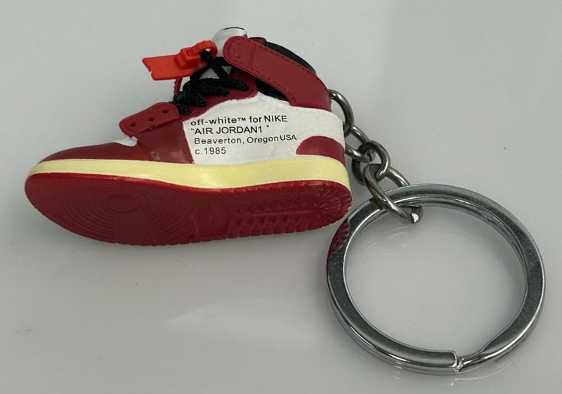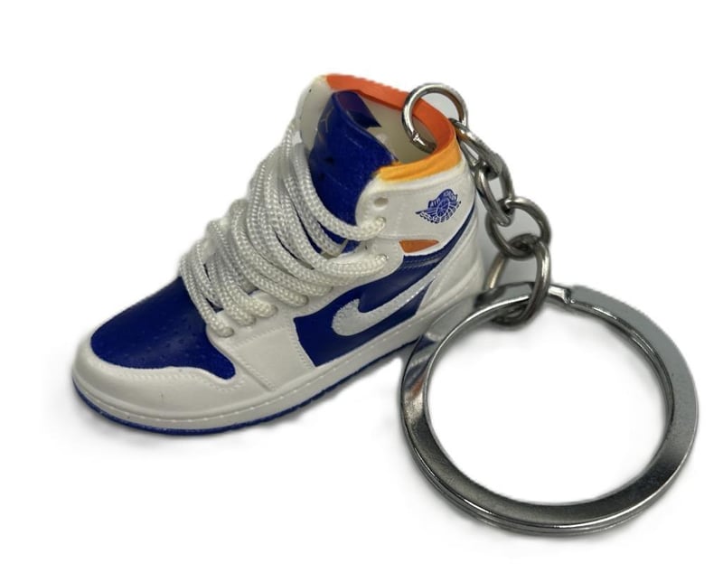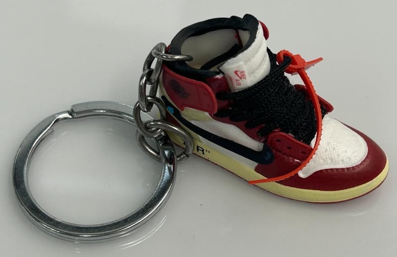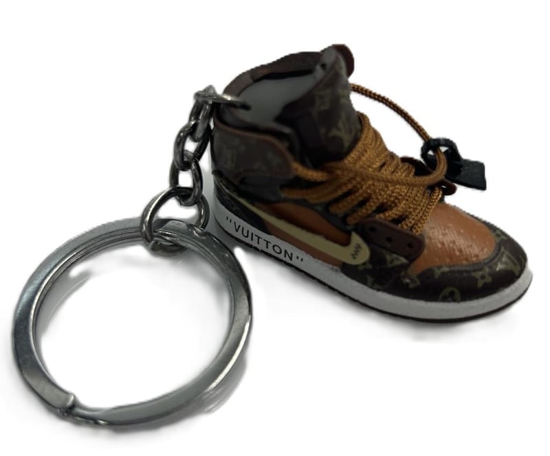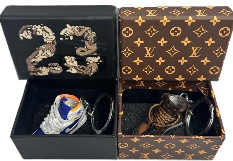 SET OF TWO SNEAKER KEYCHAINS IN MINIATURE BOXES — ONE JORDAN “23” BLUE/ORANGE DESIGN AND ONE LOUIS VUITTON MONOGRAM BROWN DESIGN. PRESENTED IN BRANDED GIFT BOXES WITH FOAM INSERTS.