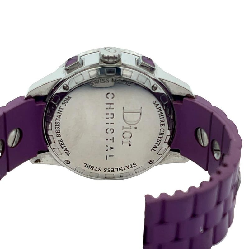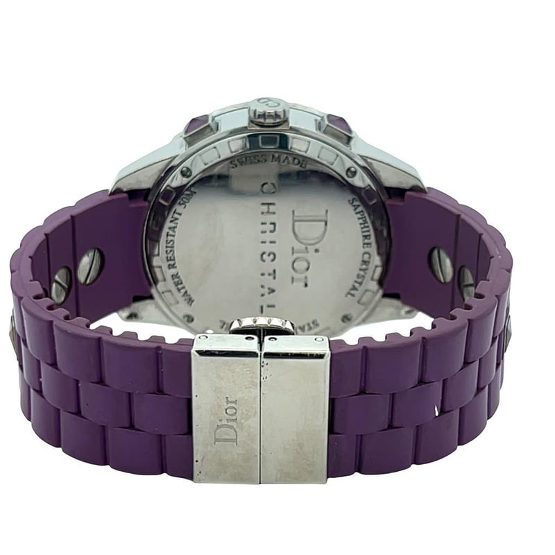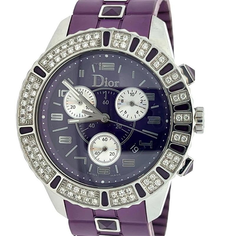 DIOR CHRISTAL CHRONOGRAPH WATCH, STAINLESS STEEL CASE WITH DIAMOND-SET BEZEL AND PURPLE CRYSTAL INSERTS, PURPLE DIAL WITH SILVER SUBDIALS AND DIAMOND HOUR MARKERS, SWISS QUARTZ MOVEMENT, SAPPHIRE CRYSTAL, 38MM CASE, WATER RESISTANT, PURPLE CERAMIC AND STAINLESS STEEL BRACELET WITH DEPLOYMENT CLASP, INCLUDES ORIGINAL DIOR BOX, LIGHT WEAR WITH MINOR SCRATCHES TO CASE AND CLASP.Condition: Good - Refer To Images