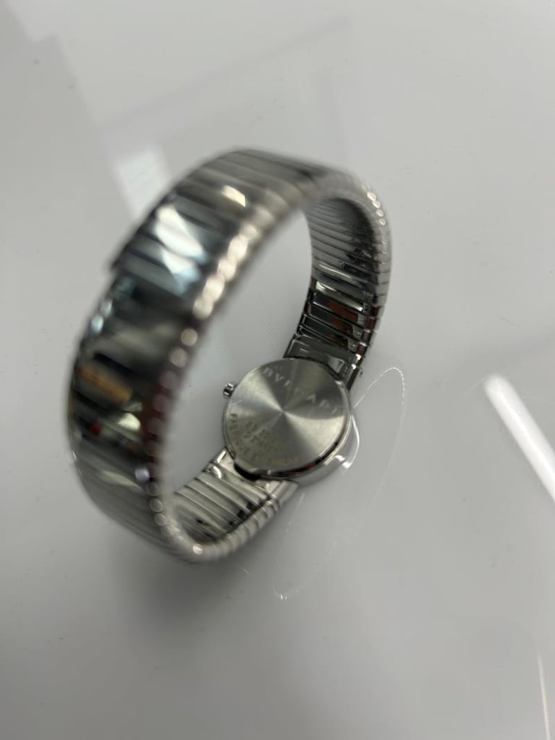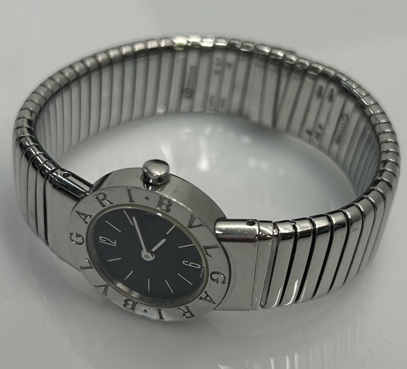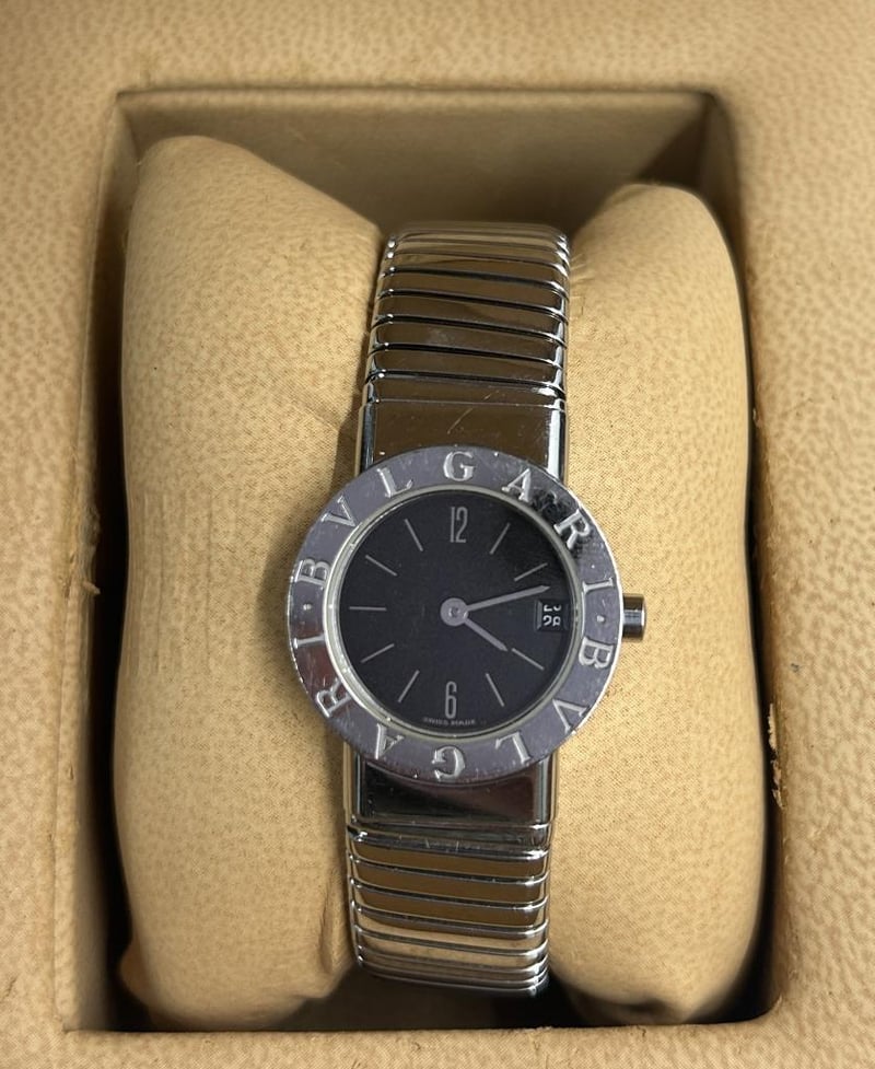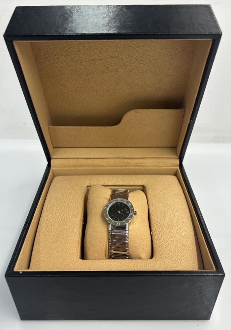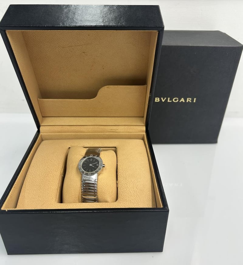 BVLGARI BVLGARI-BVLGARI WATCH, MODEL BB232TS, BLACK DIAL WITH SILVER-TONE HANDS AND LOGO-ENGRAVED BEZEL, CASE SIZE 28MM, SWISS QUARTZ MOVEMENT, STAINLESS STEEL CASE AND TUBOGAS CUFF BRACELET, SAPPHIRE CRYSTAL, INCLUDES ORIGINAL BVLGARI BOX, GOOD CONDITION WITH LIGHT WEAR CONSISTENT WITH AGE.