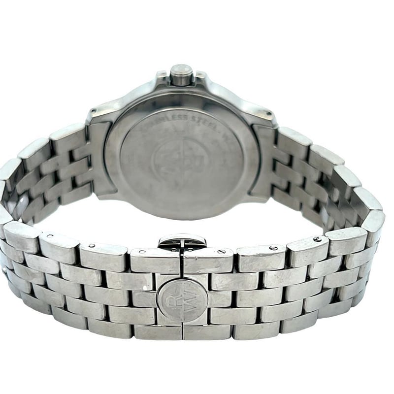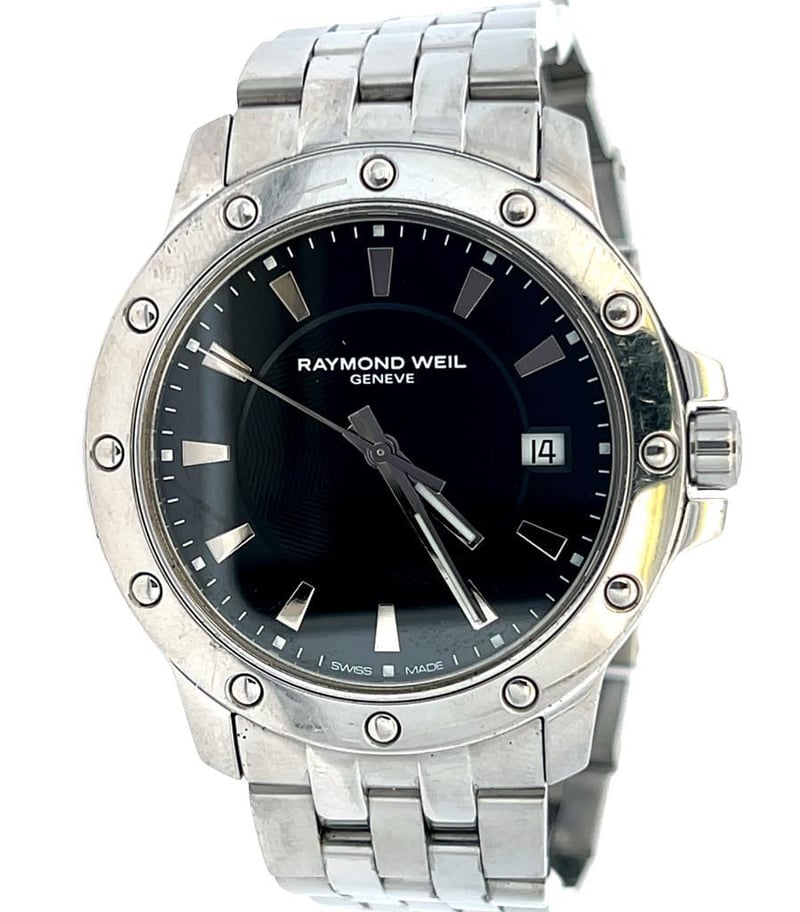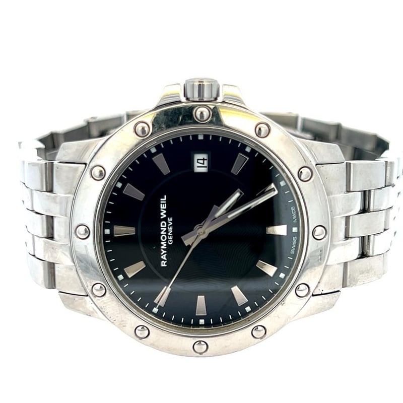 RAYMOND WEIL GENEVE STAINLESS STEEL WATCH, REFERENCE: 5599, BLACK DIAL WITH SILVER-TONE INDEX HOUR MARKERS, LUMINOUS HANDS, AND DATE DISPLAY AT 3 O’CLOCK POSITION. FEATURES A BRUSHED AND POLISHED STAINLESS STEEL CASE WITH SCREW-DETAIL BEZEL, CASE MEASURES APPROXIMATELY 40MM, SWISS QUARTZ MOVEMENT, SAPPHIRE CRYSTAL, AND WATER RESISTANCE TO 100M. COMPLETED WITH A SOLID STAINLESS STEEL LINK BRACELET AND RAYMOND WEIL SIGNED BUTTERFLY CLASP.Condition: Good - Refer To Images