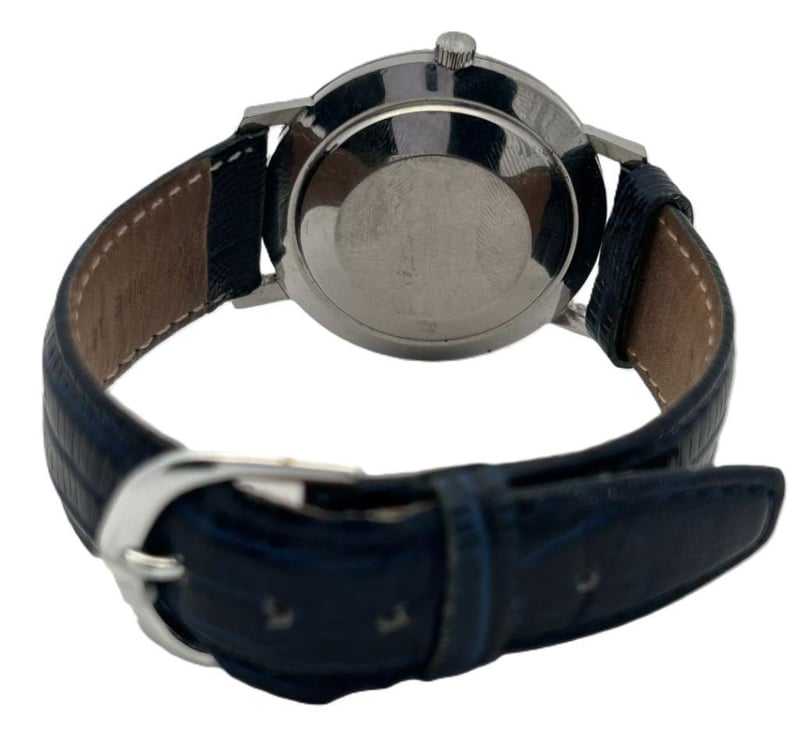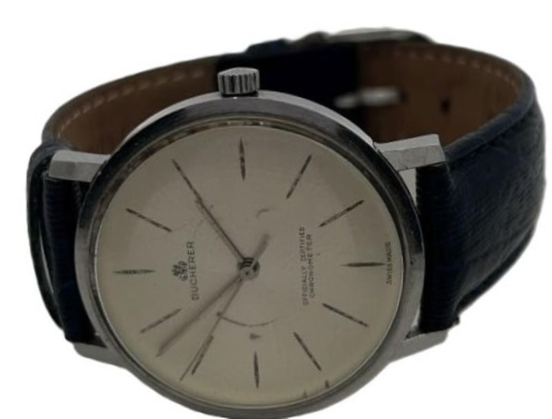 BUCHERER AUTOMATIC VINTAGE WATCH, CHAMPAGNE LINEN DIAL WITH BATON HOUR MARKERS, OFFICIALLY CERTIFIED CHRONOMETER AUTOMATIC MOVEMENT, CASE MEASURES 34MM, NAVY BLUE LEATHER STRAP WITH SILVER-TONE BUCKLE, CIRCA 1960'S. NOTE: MARKS ON DIAL SEE PHOTOS.Condition: Good - Refer To Images