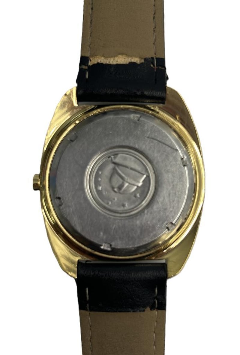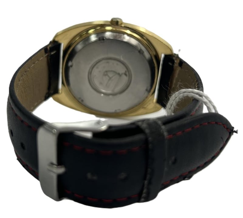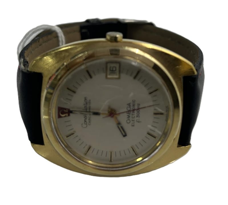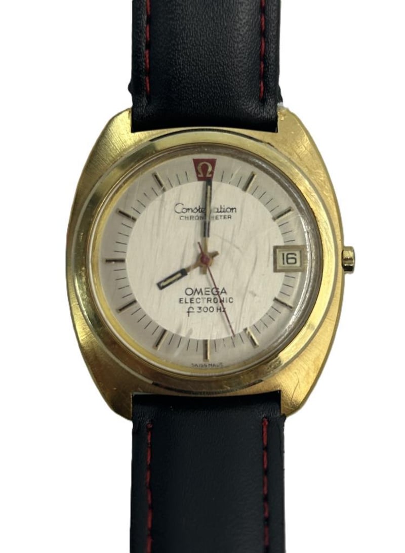 OMEGA CONSTELLATION ELECTRONIC CHRONOMETER F300HZ WATCH, VINTAGE MODEL FEATURING A GOLD-TONE CASE AND WHITE DIAL WITH APPLIED INDICES, DATE DISPLAY AT 3 O’CLOCK, RED-TIPPED SECONDS HAND, OMEGA LOGO AT 12, AND SIGNED CROWN. HUMMING TUNING FORK MOVEMENT (CAL. 1250, ESA 9162), GOLD-PLATED CASE APPROX. 38MM, FITTED WITH AN AFTERMARKET BLACK LEATHER STRAP WITH RED STITCHING. SCRATCHES VISIBLE ON DIAL, MINOR WEAR TO CASE PLATING.Condition: Good - Refer To Images