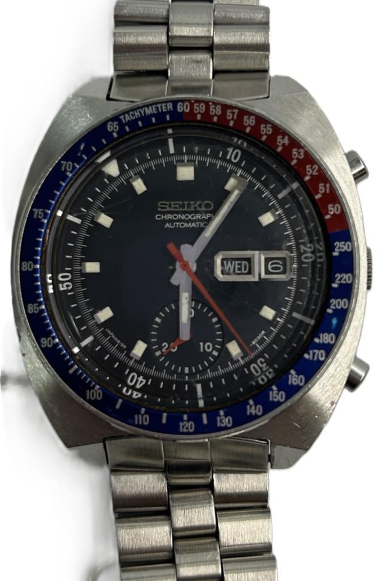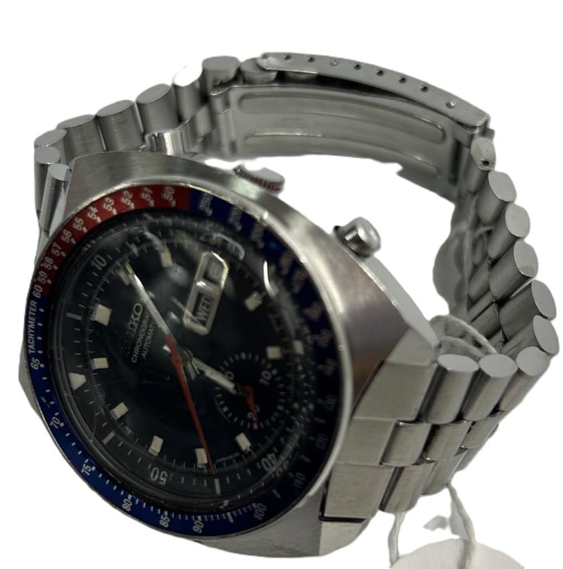 SEIKO CHRONOGRAPH AUTOMATIC PEPSI BEZEL WATCH, REFERENCE 6139-6002, FEATURING A BLACK DIAL WITH SUB-REGISTER, DAY/DATE DISPLAY, RED CHRONOGRAPH SECONDS HAND, AND BLUE/RED “PEPSI” TACHYMETER BEZEL. STAINLESS STEEL CASE AND BRACELET, AUTOMATIC MOVEMENT (CAL. 6139), APPROXIMATELY 41 MM CASE SIZE. ORIGINAL SEIKO BRACELET, LIGHT SURFACE WEAR CONSISTENT WITH AGE, CRYSTAL SCRATCHES VISIBLE.Condition: Good - Refer To Images