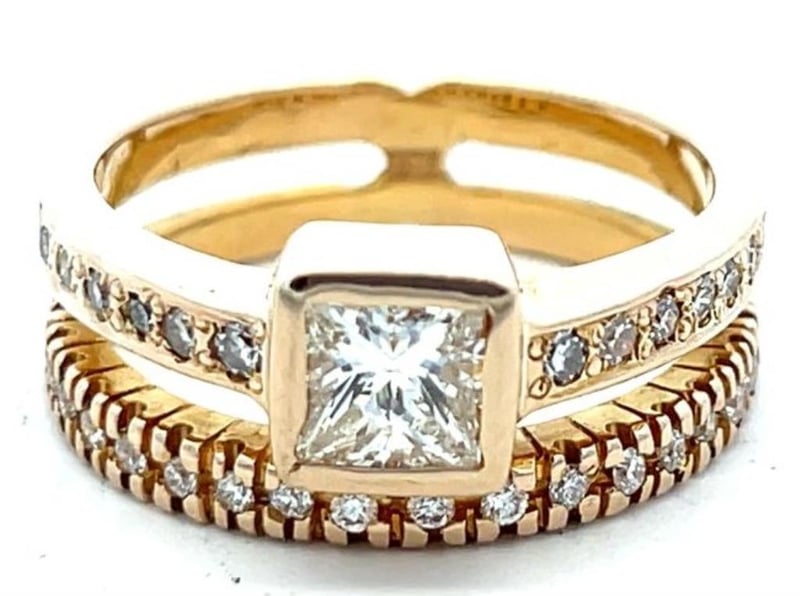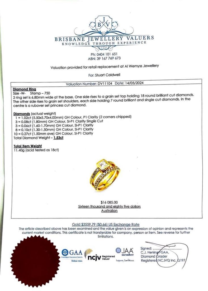 18CT YELLOW GOLD 1.53CT DIAMOND 2 RING SET, CENTRE 1.02CT PRINCESS CUT DIAMOND BEZEL SET WITH 7 ROUND BRILLIANT CUT AND SINGLE CUT DIAMONDS GRAIN SET IN EACH SHOULDER, 18 ROUND BRILLIANT CUT DIAMONDS CLAW SET IN BAND, TOTAL DIAMOND WEIGHT 1.53CT G-H SI/P1, STAMP 750, RING WEIGHT 11.43GRAMS. THIS ITEM HAS BEEN PROFESSIONALLY VERIFIED AS A GENUINE PRODUCT AND COMES WITH ACCOMPANYING 3RD PARTY VALUATION $16,085.00 Condition: Good - Refer To Images
