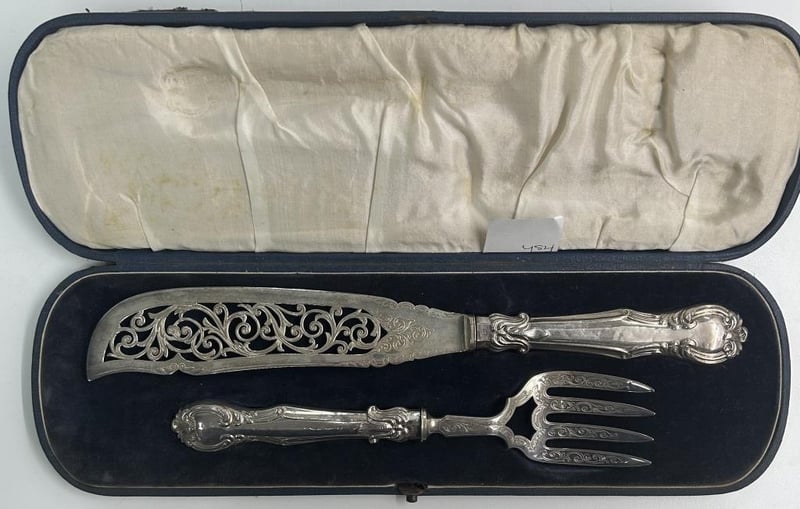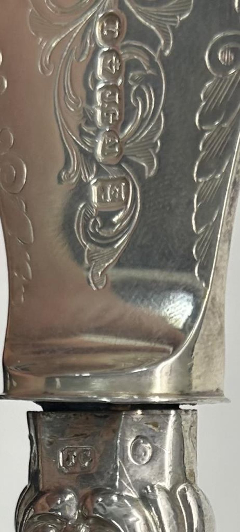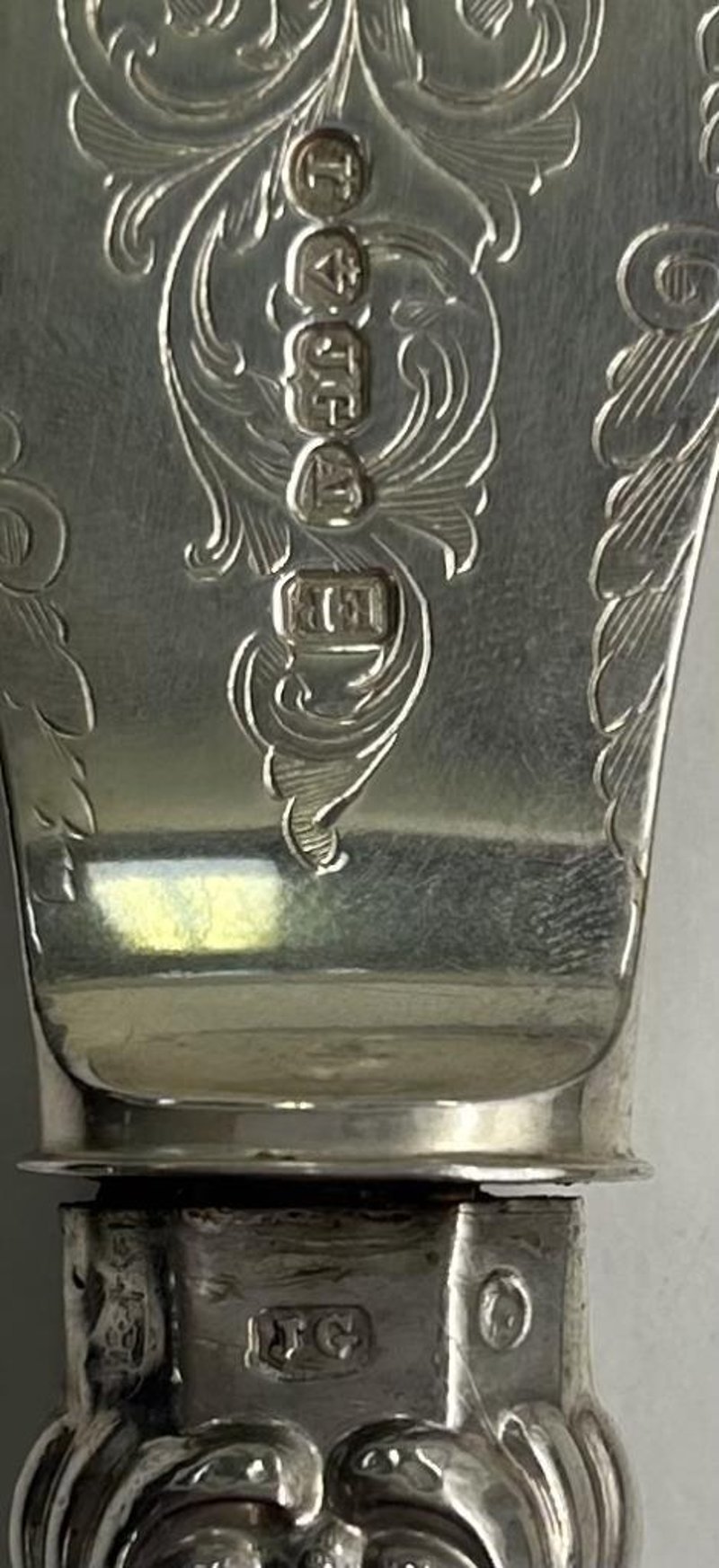 ANTIQUE STERLING SILVER "FISH SERVER SET" CIRCA 1850'S, SILVER LARGE KNIFE (ESTIMATE MEASURE 32X4X1.3CM) & FORK (ESTIMATE MEASURE 23X4.7X1.5CM), BOTH HANDLES - SILVER LION HALLMARK/XRF SILVER TEST, TOTAL WEIGHT 265.8 GRAMS, ORIGINAL BLUE VELVET CASE, MADE IN ENGLAND.