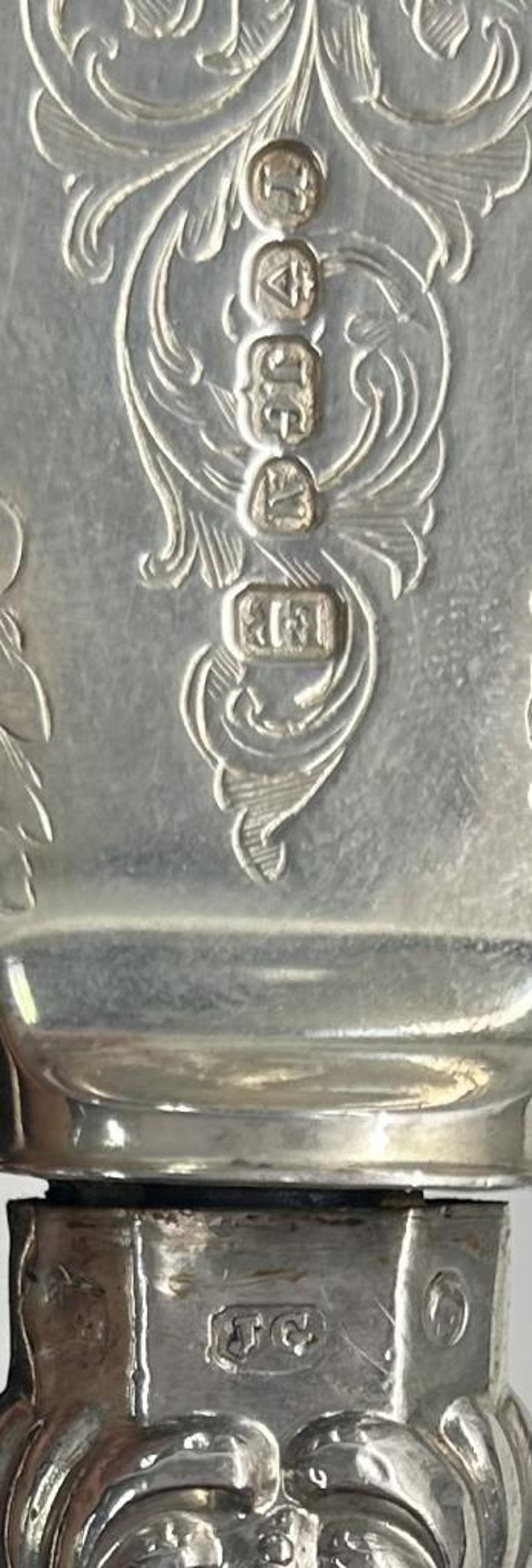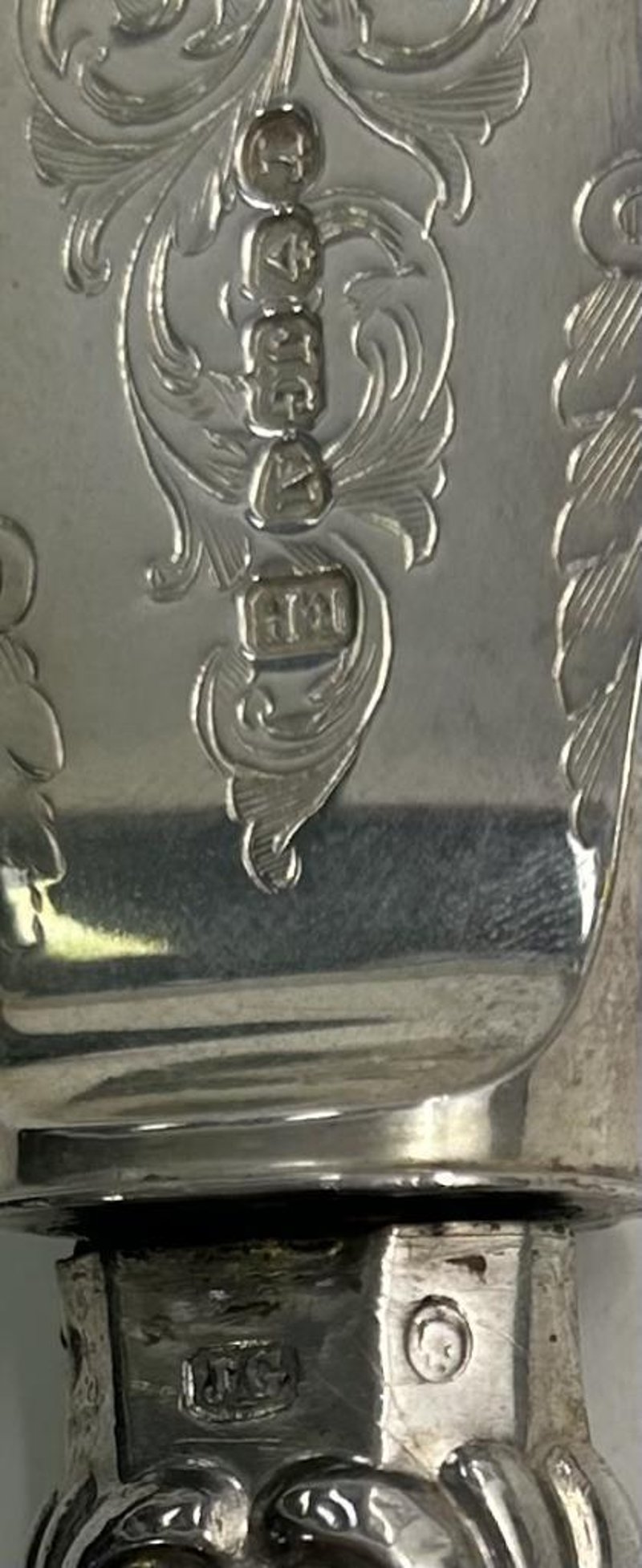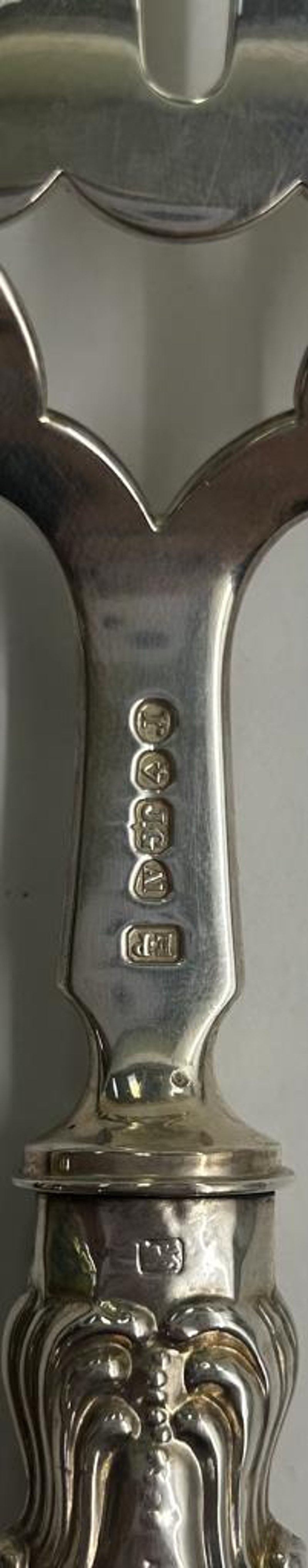 ANTIQUE STERLING SILVER "FISH SERVER SET" CIRCA 1850'S, SILVER LARGE KNIFE (ESTIMATE MEASURE 32X4X1.3CM) & FORK (ESTIMATE MEASURE 23X4.7X1.5CM), BOTH HANDLES - SILVER LION HALLMARK/XRF SILVER TEST, TOTAL WEIGHT 265.8 GRAMS, ORIGINAL BLUE VELVET CASE, MADE IN ENGLAND.