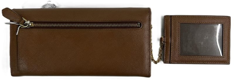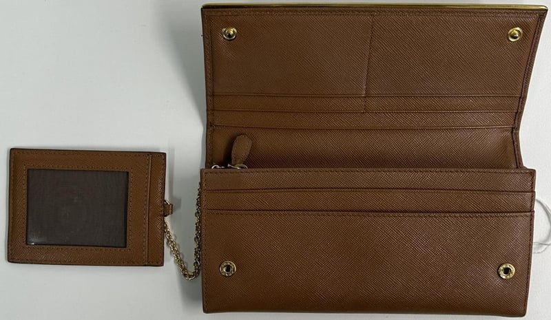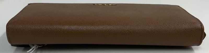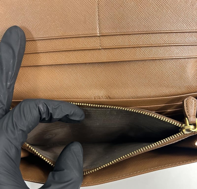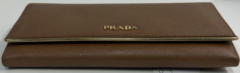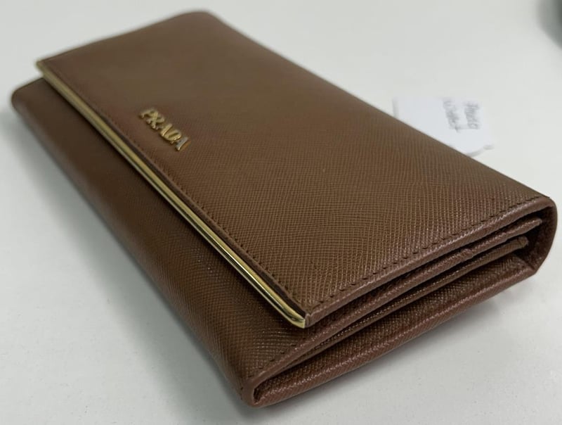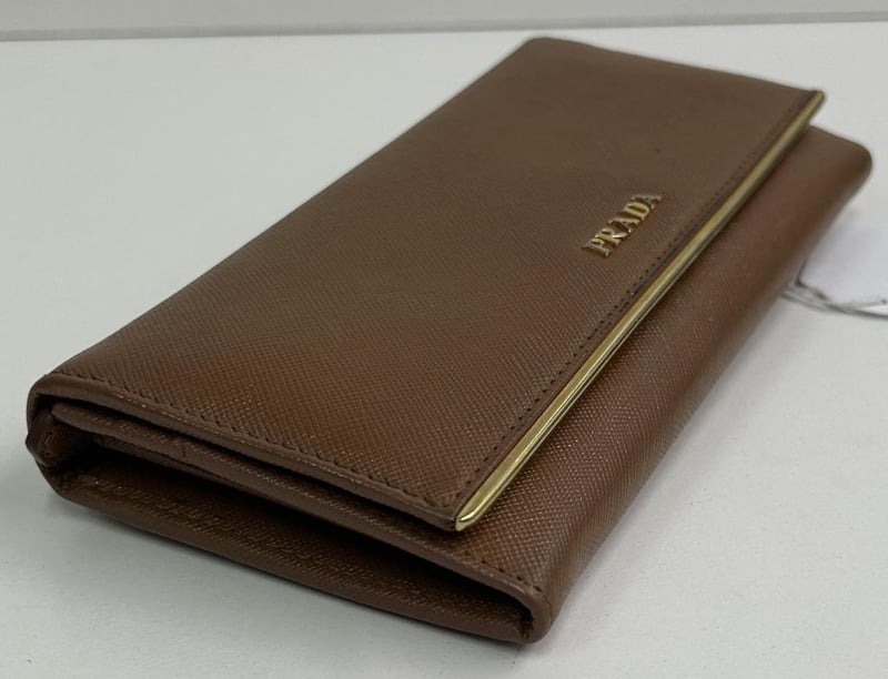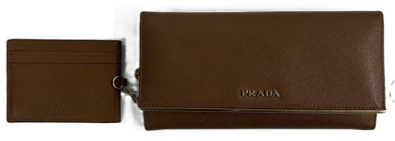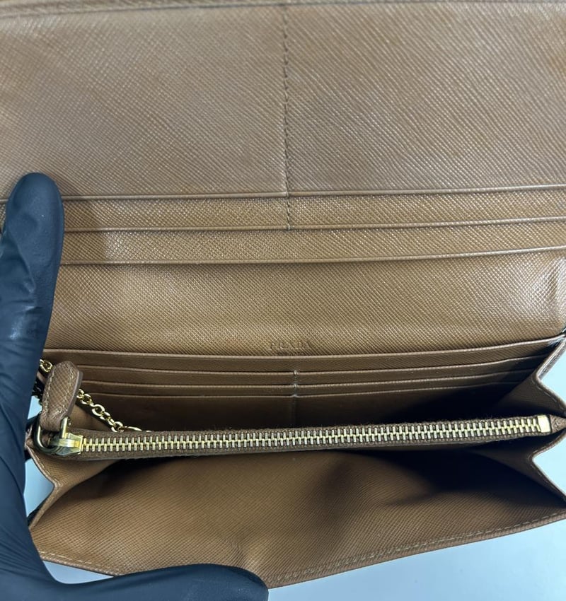PRADA LONG WALLET WITH REMOVABLE CARD HOLDER, TAN SAFFIANO LEATHER WITH GOLD TONE HARDWARE, BACK ZIP POCKET, DOUBLE SNAP LOCK CLOSURE, 8 CARD SLOTS, 2 COMPARTMENTS WITH CENTRE ZIP COMPARTMENT, 2 SLIP COMPARTMENTS, REMOVABLE CARD HOLDER ATTACHED TO GOLD CHAIN HAS 2 CARD SLOTS & 1 WINDOW SLOT, WALLET MEASURES 19 X 9 X 2.5CM, MADE IN ITALY, NOTE: SLIGHT DISCOLORATION ON GOLD PLATING HARDWARE. THIS ITEM HAS BEEN PROFESSIONALLY VERIFIED AS A GENUINE PRODUCT AND COMES WITH ACCOMPANYING 3RD PARTY CERTIFICATE OF AUTHENTICITY.