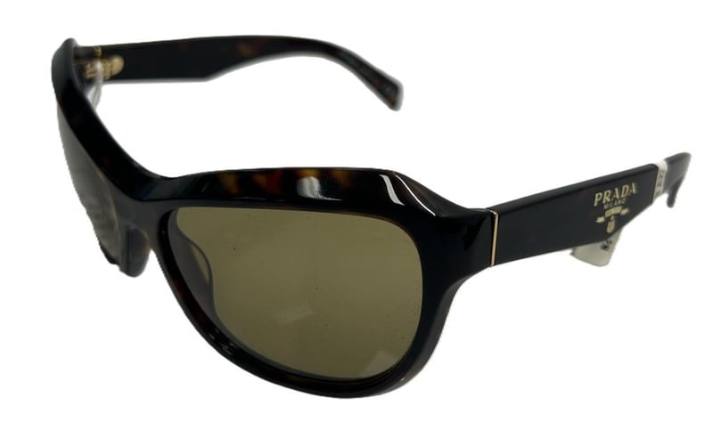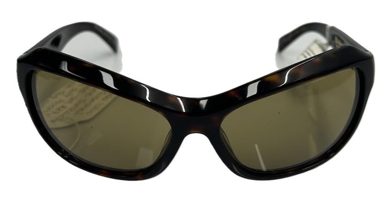 PRADA SPR A27S TORTOISESHELL SHIELD SUNGLASSES FEATURING GLOSSY DARK HAVANA ACETATE FRAMES WITH BROWN-TINTED LENSES AND GOLD-TONE PRADA MILANO LOGO DETAILING ON TEMPLES. NEW WITH TAG, RRP $591.00. MADE IN ITALY.