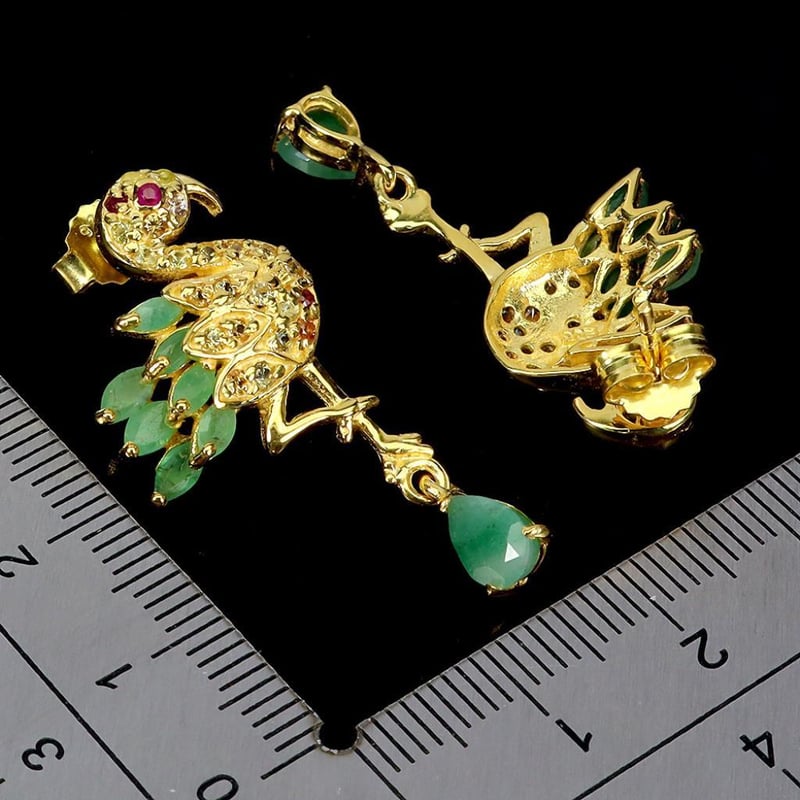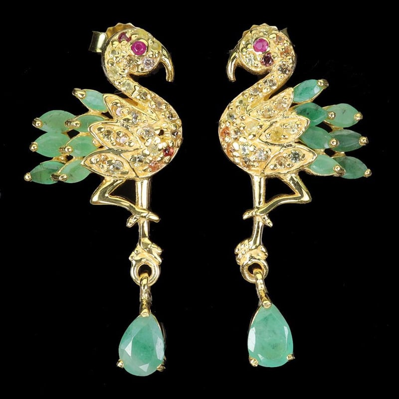 Natural Emerald Sapphire & Ruby Flamengo Earrings. Made In Solid Sterling Silver And Plated In14K Yellow Gold. Features Natural Green Emeralds, Natural Fancy Diamond Cut Sapphires And Natural Red Rubies As Eyes. Earrings Measure 34.0 X 16.0 Mm