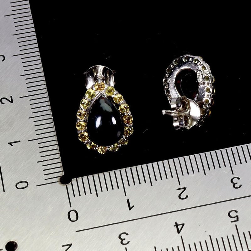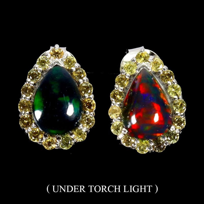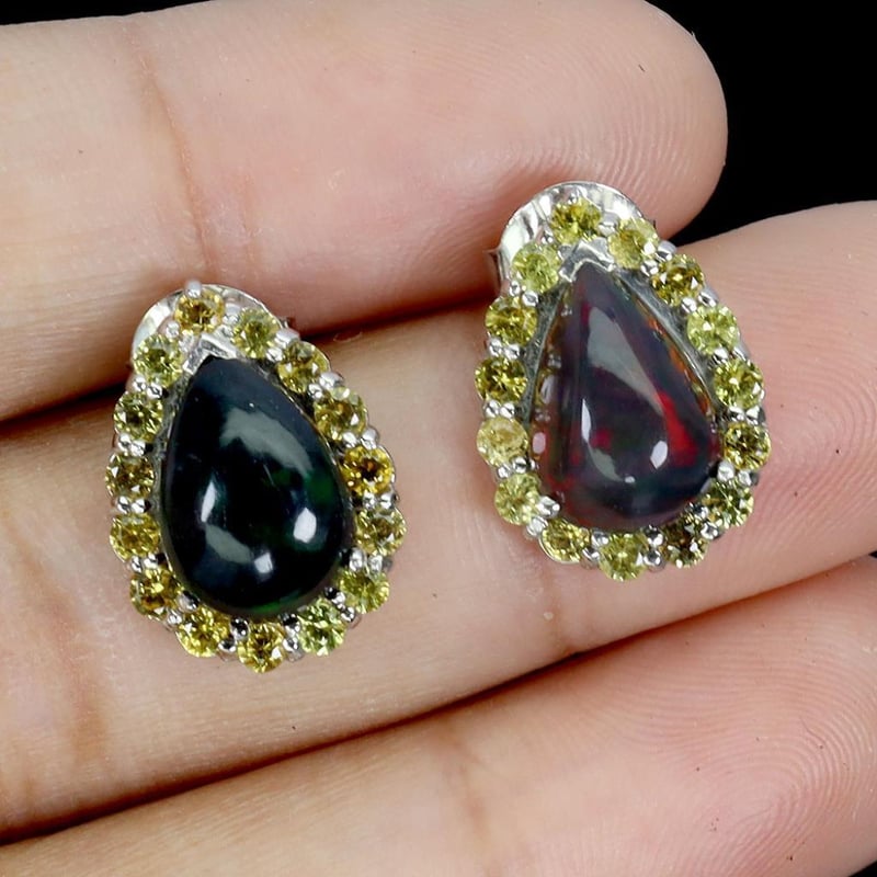 Natural Rainbow Black Fire Opal & Sapphire Stud Earrings. Made In Solid Sterling Silver And Plated In14K White Gold. Features Natural Pear Cabochon Rainbow Fire Opals And Natural Yellow Sapphires. Earrings Measure 14.0 X 10.0 Mm.