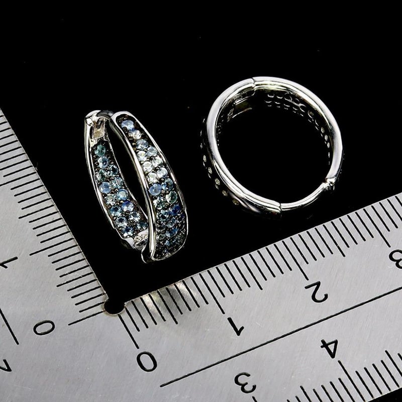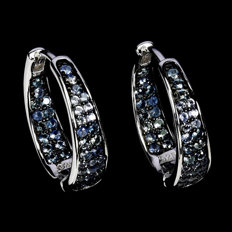 Natural Diamond Cut Blue Sapphire Hoop Earrings. Made In Solid Sterling Silver And Plated In 14K White Gold. Features Natural Diamond Cut Blue Sapphires. Earrings Measure 17X5Mm