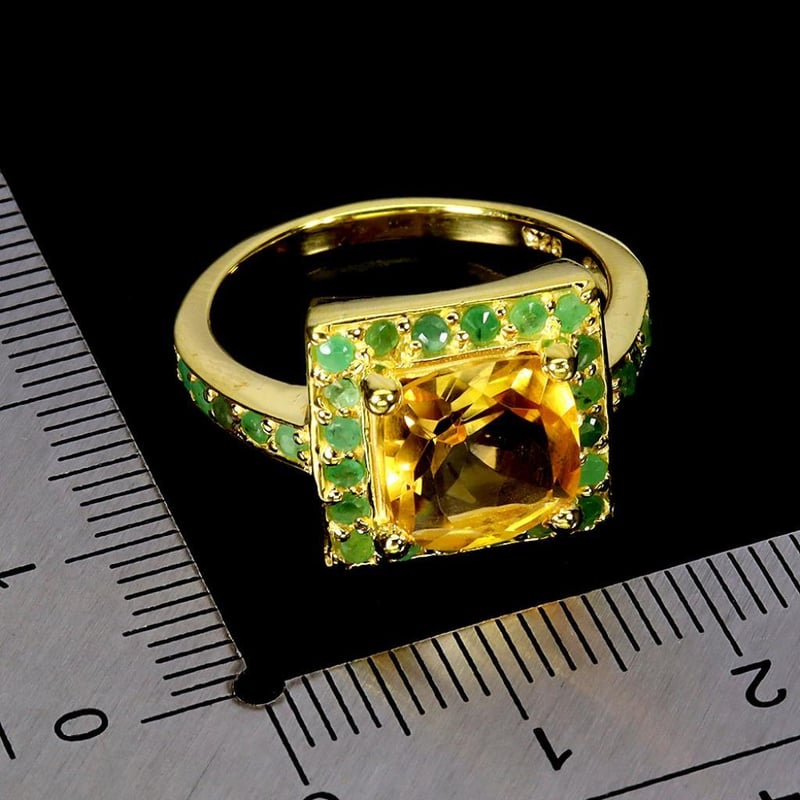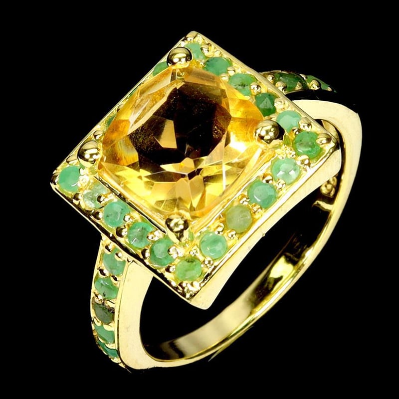 Natural Emerald & Citrine Art Deco Ring. Made In Solid Sterling Silver And Plated In14K Yellow Gold. Features Natural Green Emeralds And Natural Golden Citrine. Ring Size 7
