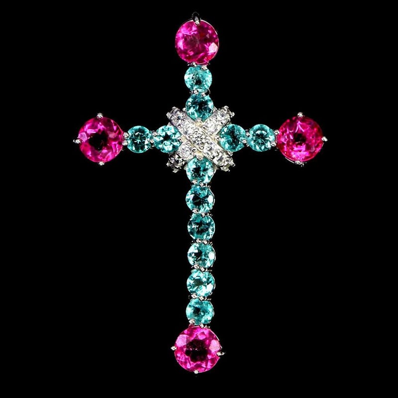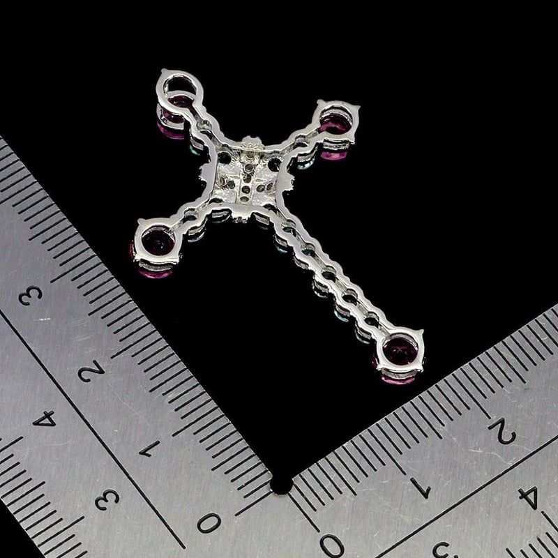 Natural Pink & Blue Topaz Cross Pendant. Made In Solid Sterling Silver And Plated In14K White Gold. Features Natural Pink And Blue Topaz And Sparkling Czs. Pendant Measures 40X28Mm