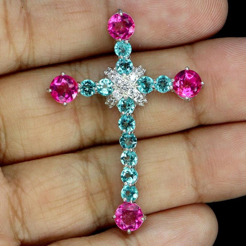 NATURAL PINK & BLUE TOPAZ CROSS PENDANT.