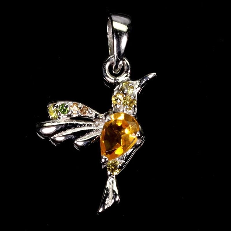 Natural Sapphire & Citrin Birdie Pendant. Made In Solid Sterling Silver And Plated In14K White Gold. Feature Natural Golden Citrine And Natural Fancy Sapphires. Pendant Measures 23.0 X 15.0 Mm.