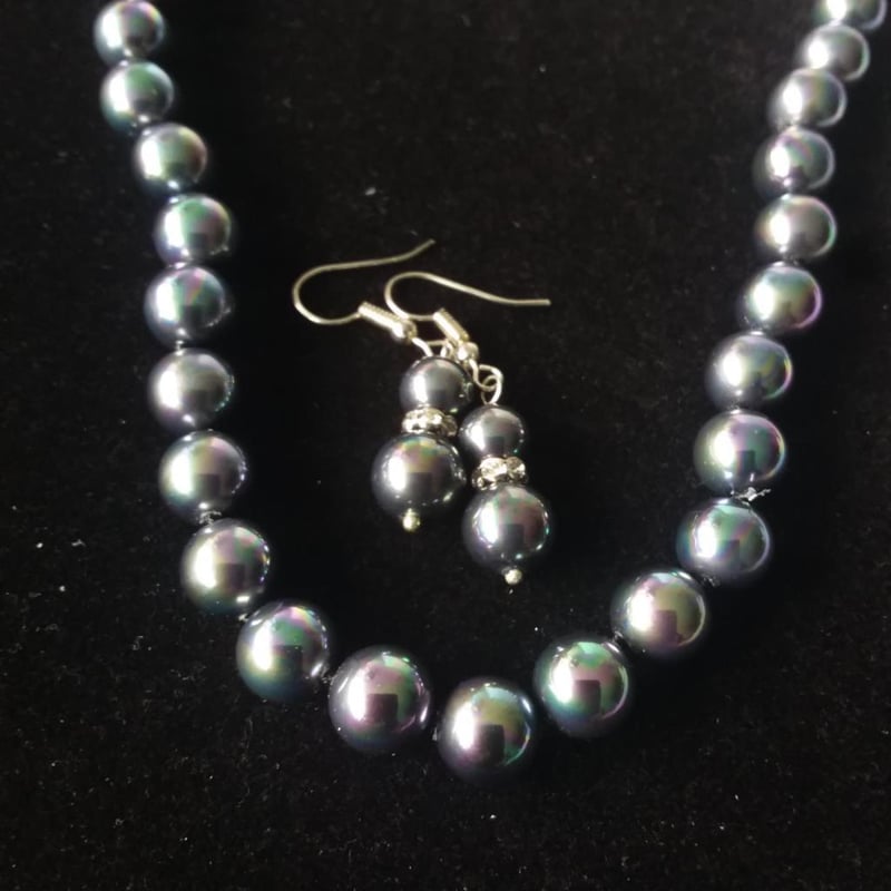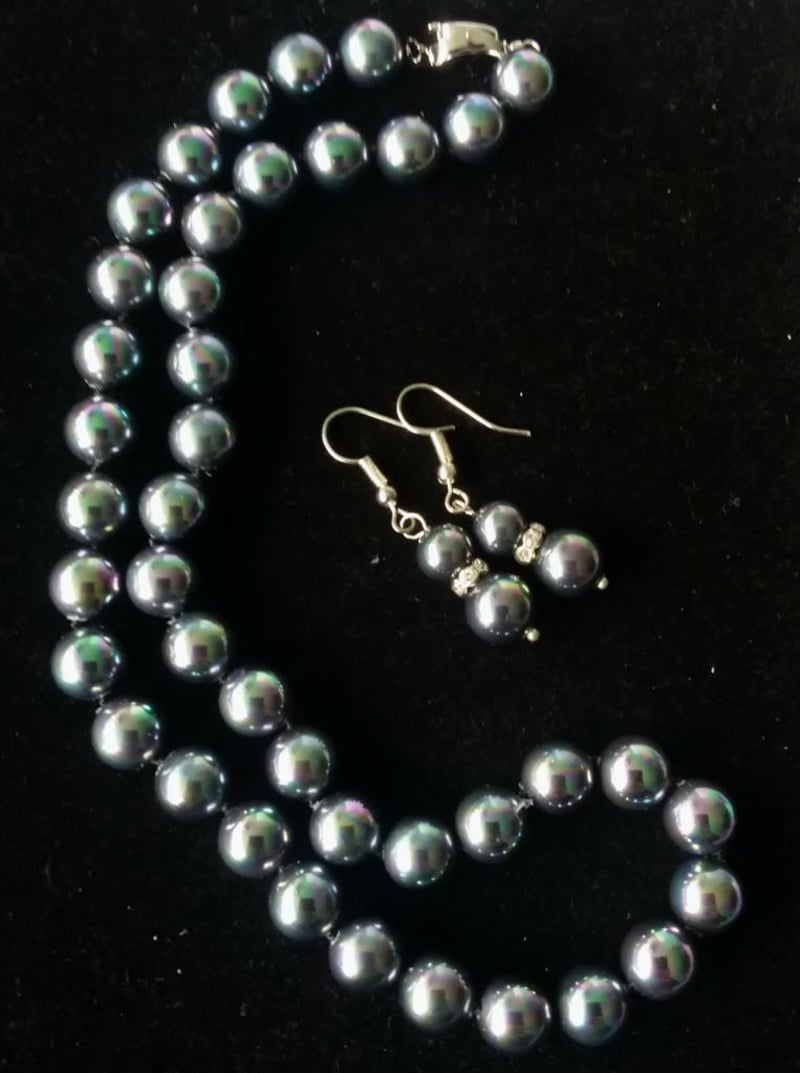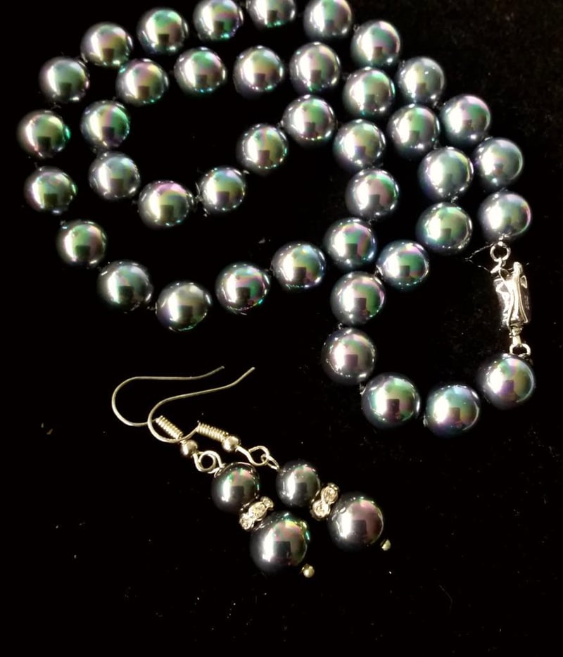 PEACOCK BLACK SEA SHELL PEARL NECKLACE EARRINGS SET