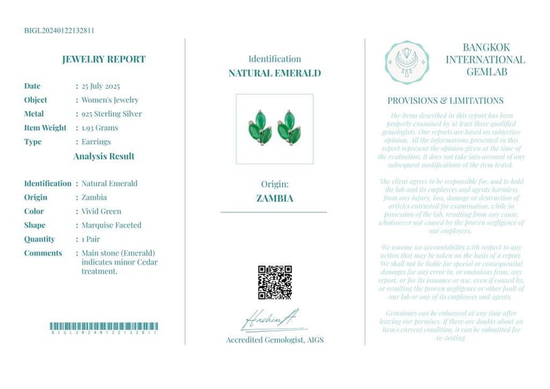 Comments : Main Stone (Emerald) Indicates Minor Cedar Treatment.