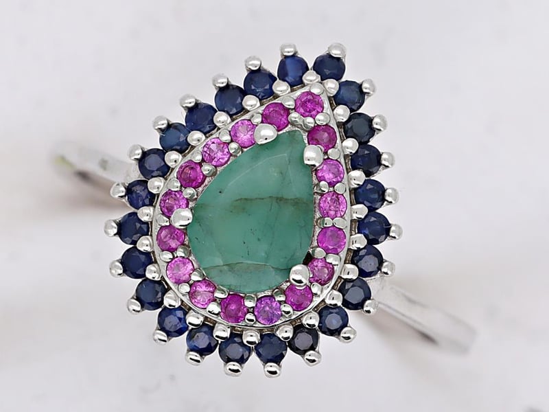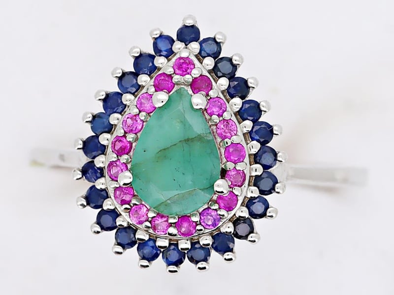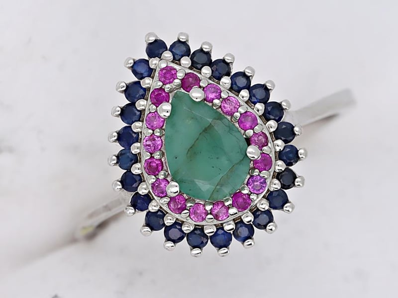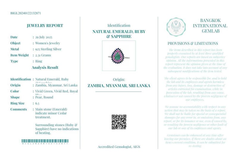NATURAL EMERALD, RUBY SRI LANKAN SAPPHIRE (UNTREATED) RING ON 925 SILVER - WITH CERTIFICATE Gemstone : Natural Emerald, Ruby Sri Lankan Sapphire (Untreated)Certificate Number : Bigl20240122132871Item Total Weight : 2.31 GramsMain Stone Color : Vivid Green, Vivid Red, Royal BlueSize : 6.5Comments : Main Stone (Emerald) Indicate Minor Cedar Treatment.Surrounding Stones (Ruby Sri Lankan Sapphire (Untreated)) Have No Indications Of Heating. ✻ Verify Report Online At Www.Bangkokinternationalgemlab.Co 0+27