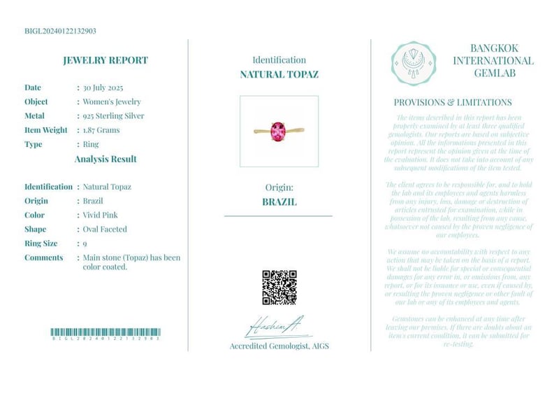 NATURAL TOPAZ RING ON 925 SILVER - WITH CERTIFICATE Gemstone : Natural TopazCertificate Number : Bigl20240122132903Item Total Weight : 1.87 GramsMain Stone Color : Vivid PinkSize : 9Comments : Main Stone (Topaz) Has Been Color Coated. ✻ Verify Report Online At Www.Bangkokinternationalgemlab.Co 0+29
