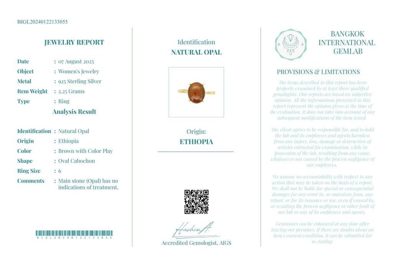 NATURAL OPAL RING ON 925 SILVER - WITH CERTIFICATE Gemstone : Natural OpalCertificate Number : Bigl20240122133055Item Total Weight : 2.25 GramsMain Stone Color : Brown With Color PlaySize : 6Comments : Main Stone (Opal) Has No Indications Of Treatment. ✻ Verify Report Online At Www.Bangkokinternationalgemlab.Co 0+39