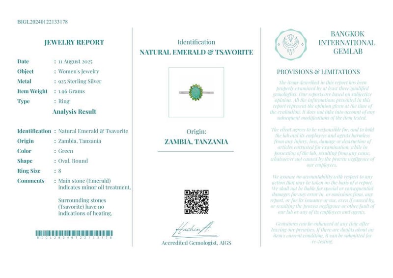 Comments : Main Stone (Emerald) Indicates Minor Oil Treatment.