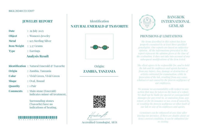 Comments : Main Stone (Emerald) Indicates Minor Oil Treatment.