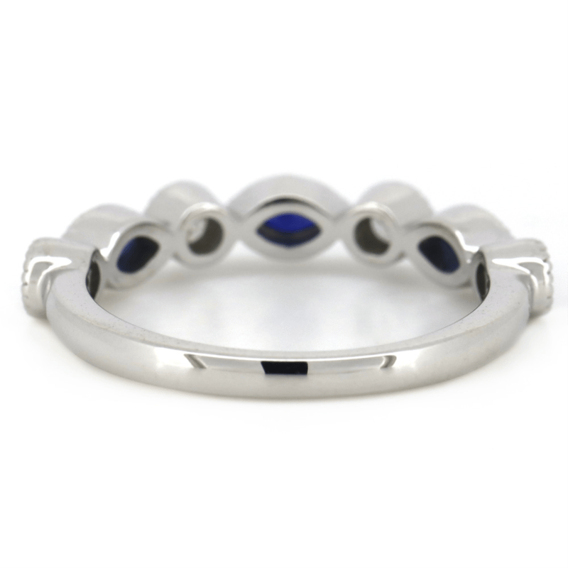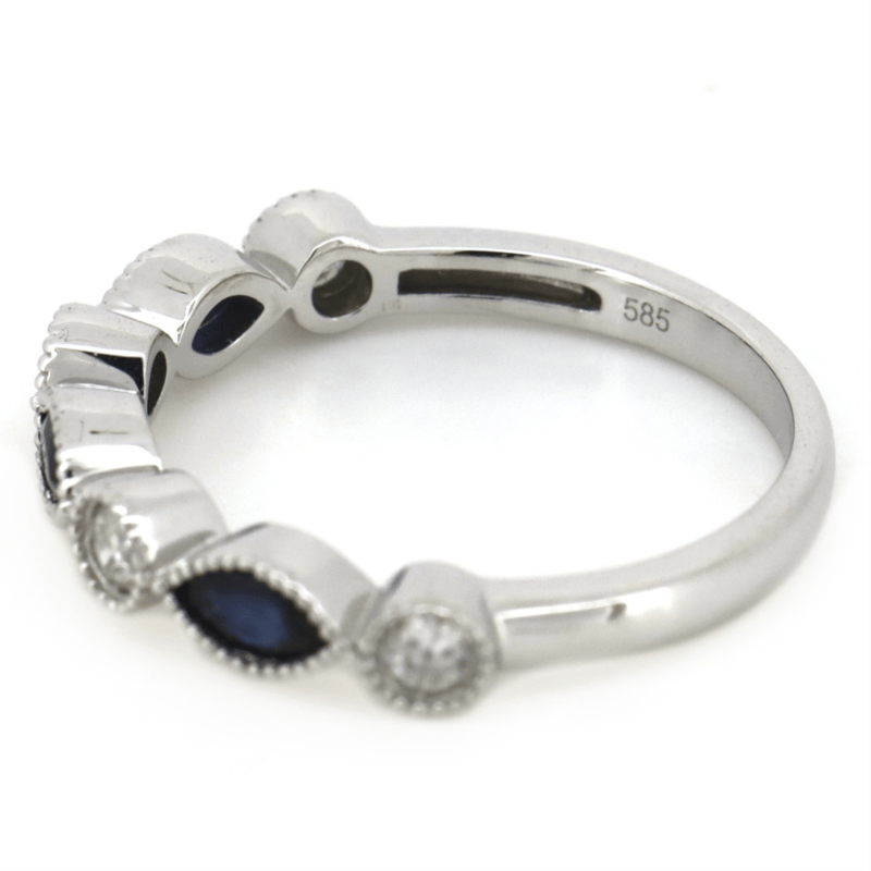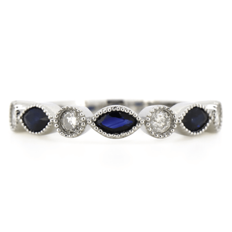 14K WHITE GOLD, BLUE SAPPHIRE AND DIAMOND, DRESS RING. THE CENTRE FEATURES, 3 MARQUISE CUT, DARK ROYAL BLUE, SAPPHIRES (0.38CT TSW, INCLUDED), BEZEL SET WITH MILLEGRAIN DETAIL. ALTERNATING BETWEEN ARE, 4 ROUND BRILLIANT CUT, DIAMONDS (0.23CT TDW, J-K COLOUR, SI2-I2 CLARITY), BEZEL SET WITH MILLEGRAIN DETAIL. RING SIZE M 1/2.